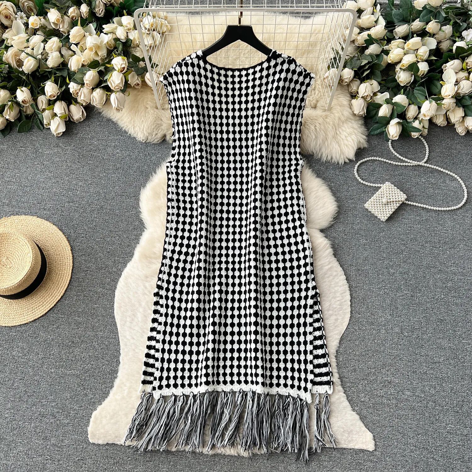 Tel ノースリーブニットタンクドレス V ネックチェック柄ストリートベーシックプレッピースタイルセーター A ラインドレス Vネック Aライン