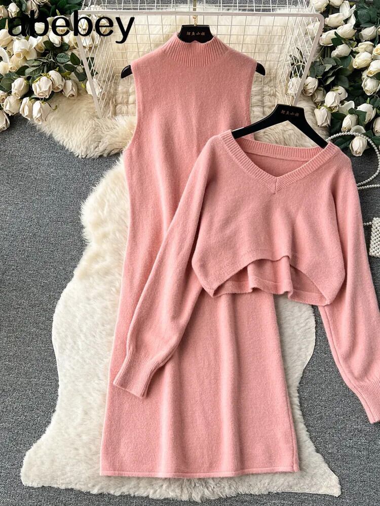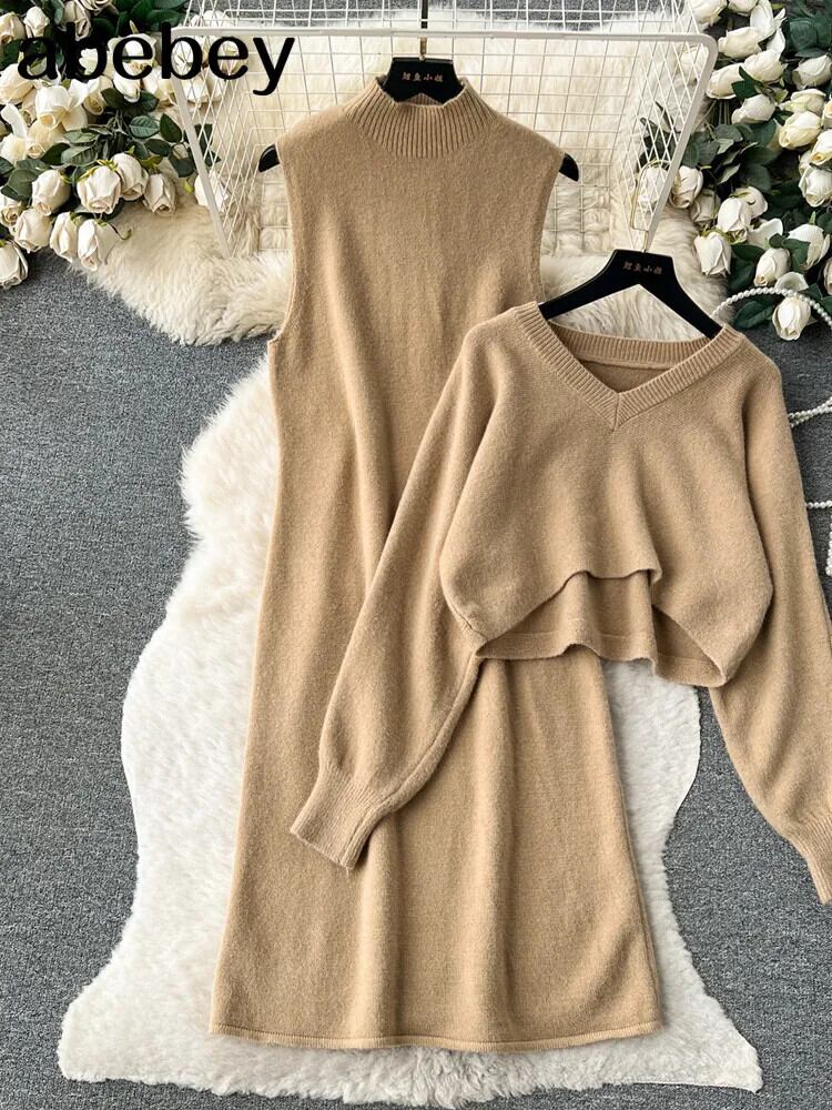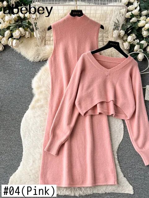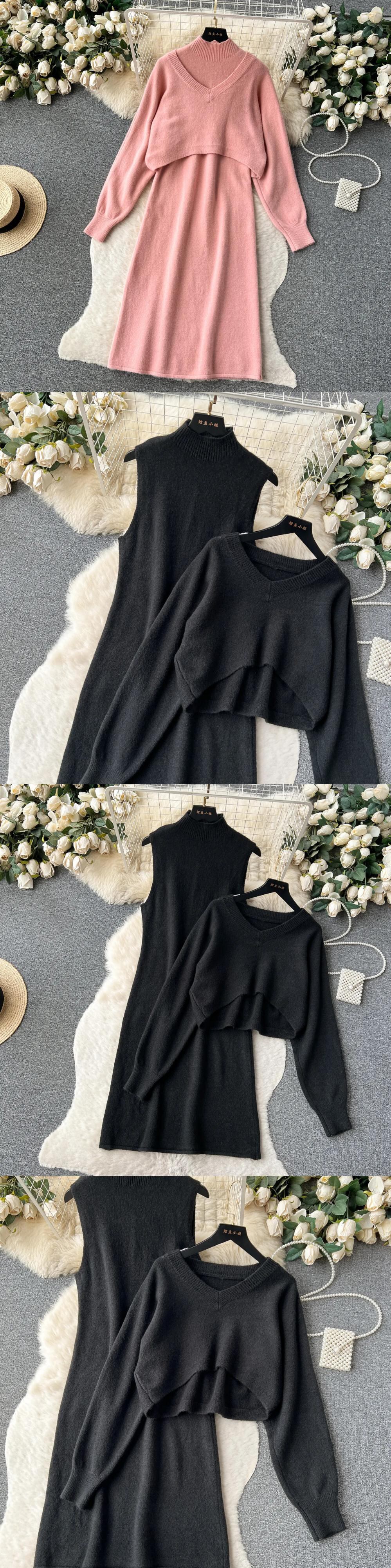 2 枚スーツ V ネックルーズケーププルオーバー + ノースリーブロング H ラインドレス秋ニットセット オータム 秋物 Vネック ソリッドカラー