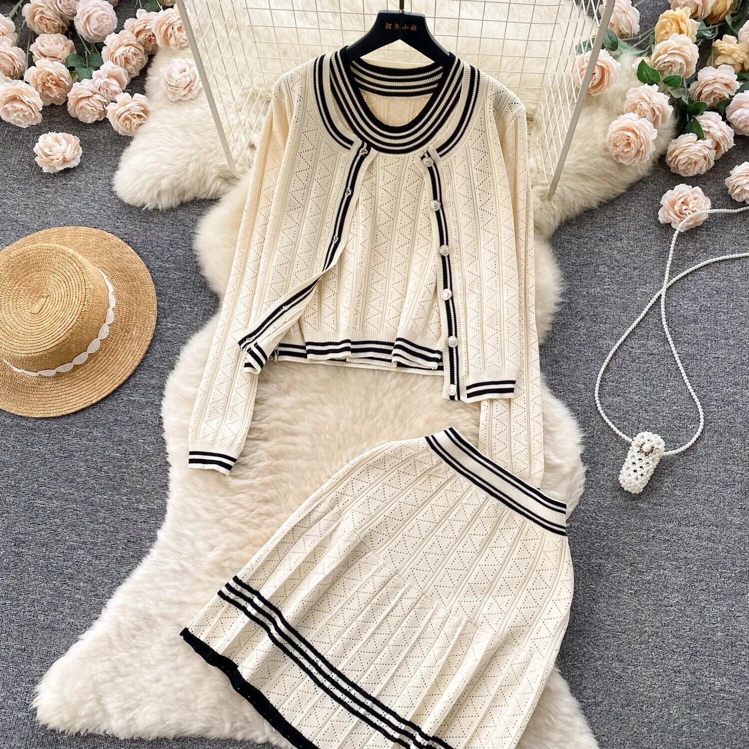 秋ニット 3 点セット長袖カーディガン + シングルブレストストラップレス + ストレッチミニスカートスーツ ロング オータム 秋物