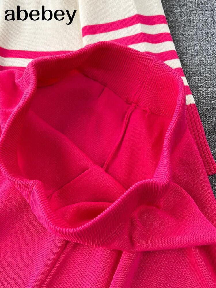 ストライプニットセットハーフカラースプリット厚手プルオーバー+ワイドレッグロングパンツルーズセータースーツ ワイドパンツ