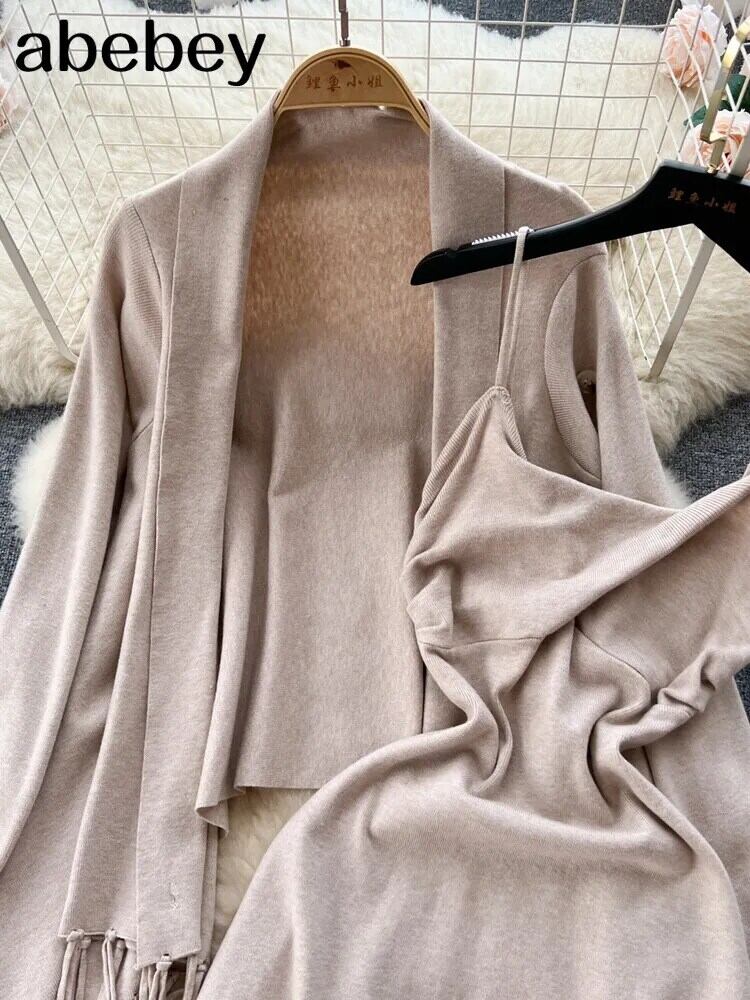 ニットセットルーズ長袖ロングカーディガンセーター + 弾性ドレスフレンチスタイルツーピースセット衣装 エラスティック 伸縮 ソリッドカラー