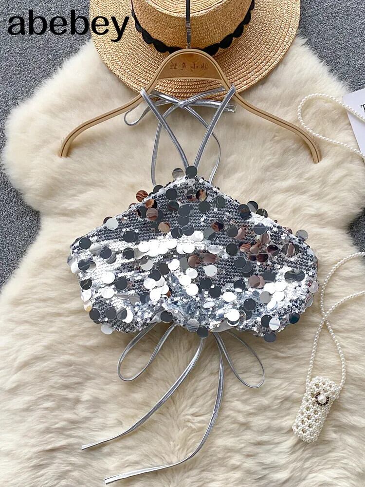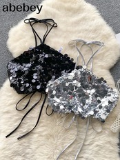セクシーメタルスパンコールタンクキャミソール夏ゴールドシルバーバックレスクロップグリッタービーチクラブショー着用タンクトップパーティークラブ着用 サマー 夏物 銀