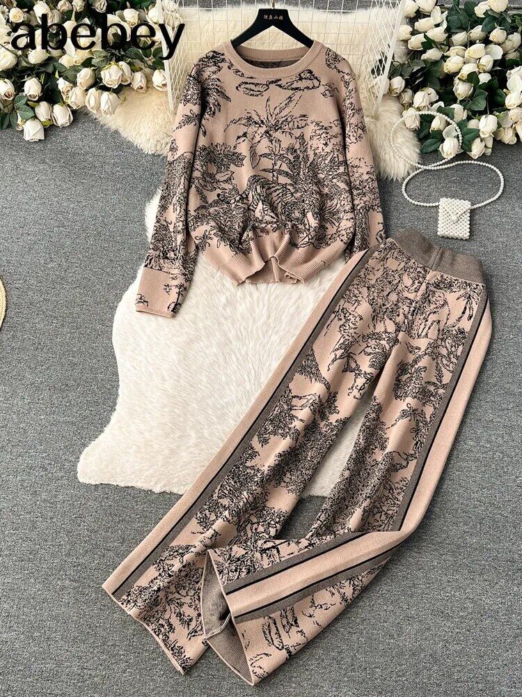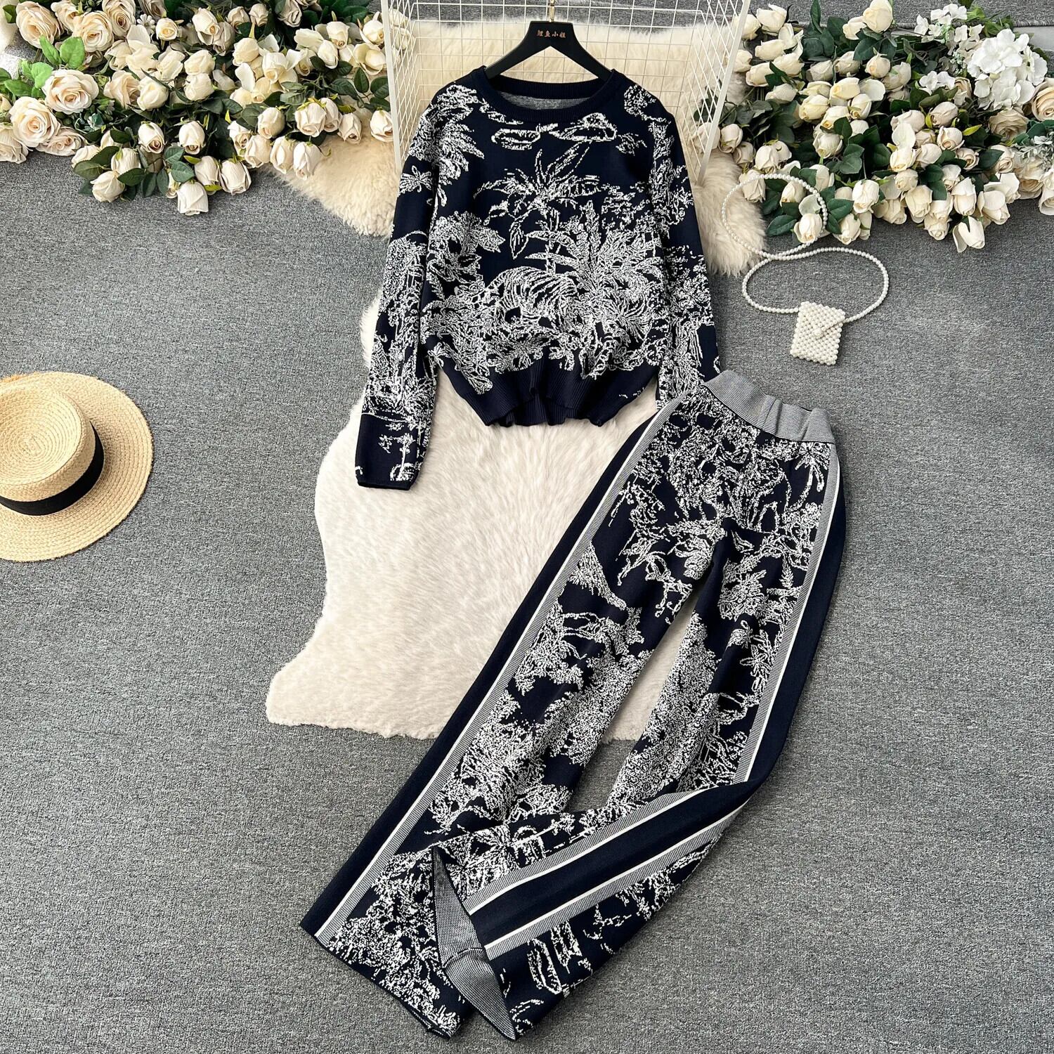 ニット秋 2 ツーピースセット長袖ルーズトップスウエストワイドレッグパンツ ロング オータム 秋物 ワイドパンツ