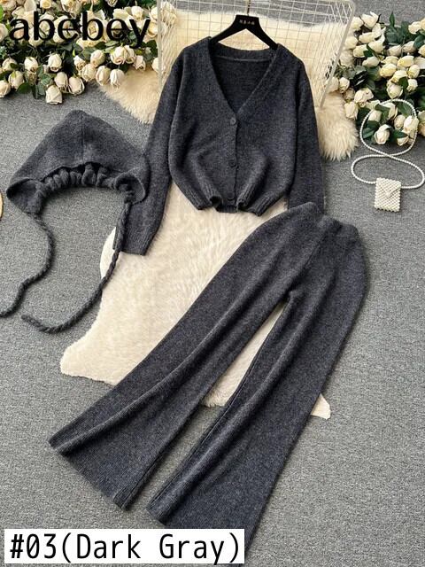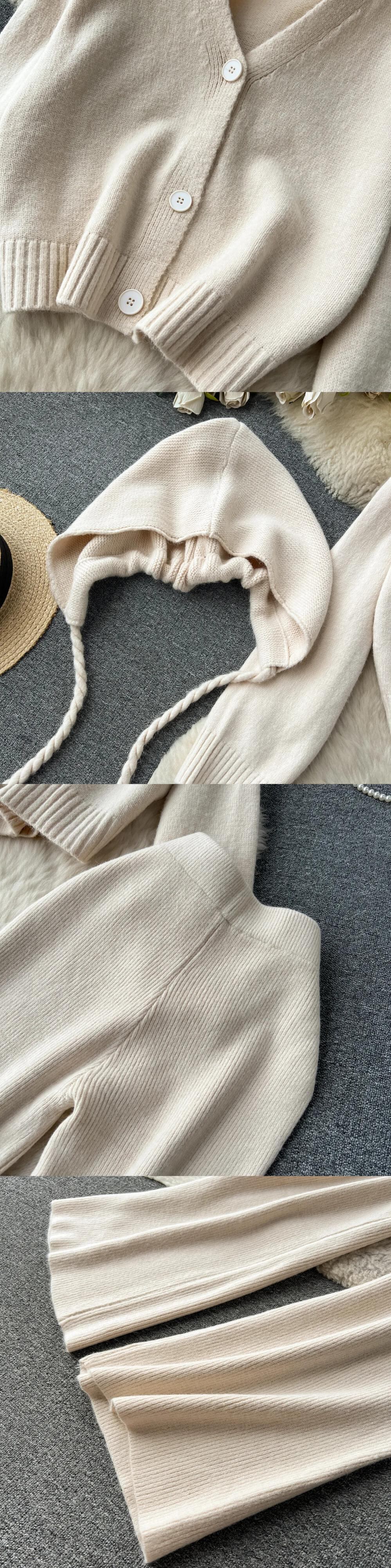 冬セーター 2 枚スーツ フード付きニット厚手プルオーバー + ワイドレッグ ロング パンツ + ヘッドギア フレンチ ニット暖かいセット ウィンター 冬物 ワイドパンツ