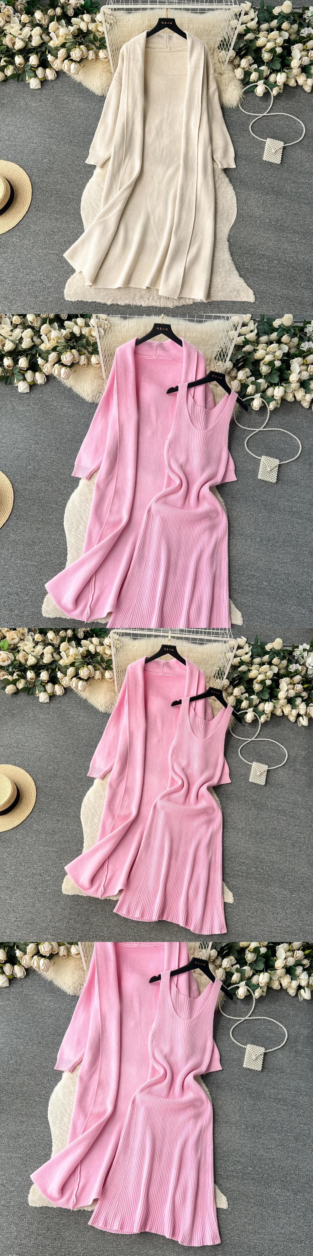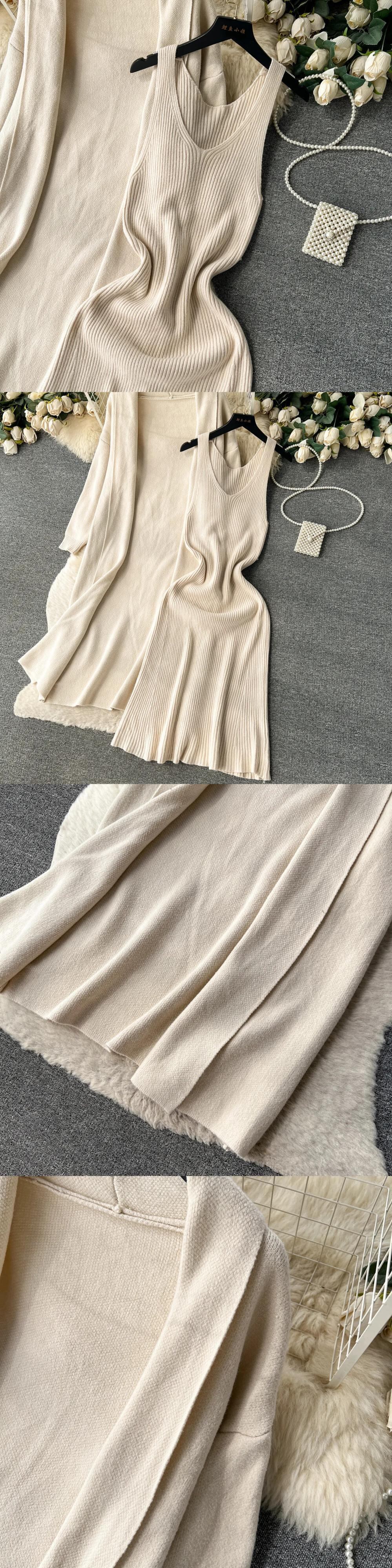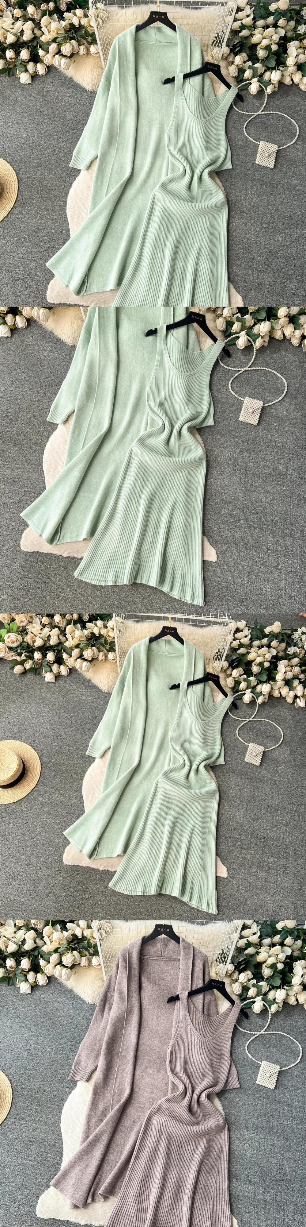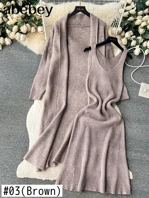 秋厚くて暖かいニットスーツストラップニットドレス + ルーズロングカーディガンセーターホーム 2 枚セット オータム 秋物