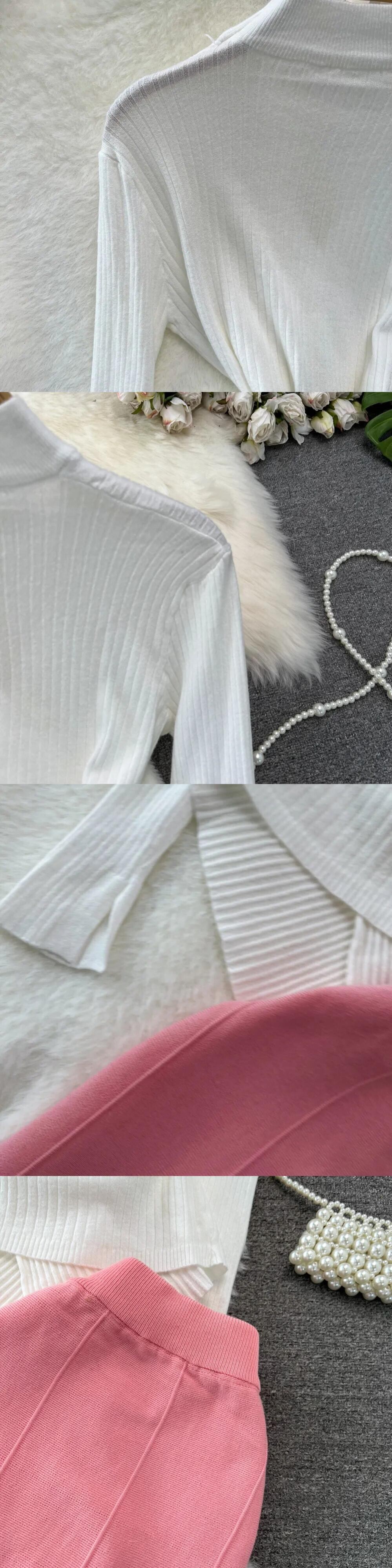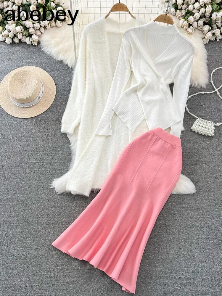 秋冬セーター白ロングニットカーディガン + ベストとパンツ 3 本セット気質スーツジャージ衣装 ホワイト オータム 秋物 ウィンター 冬物 ソリッドカラー
