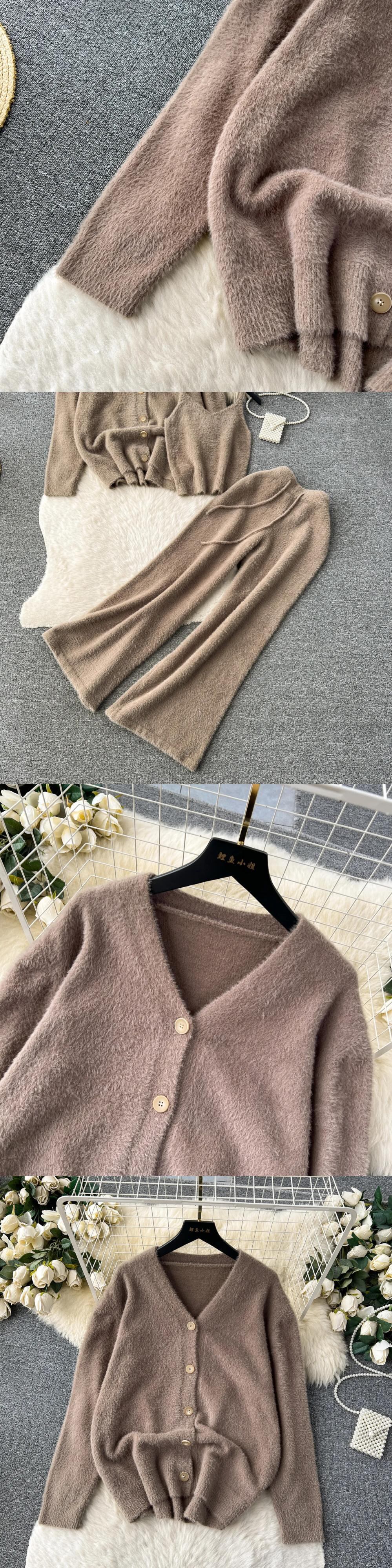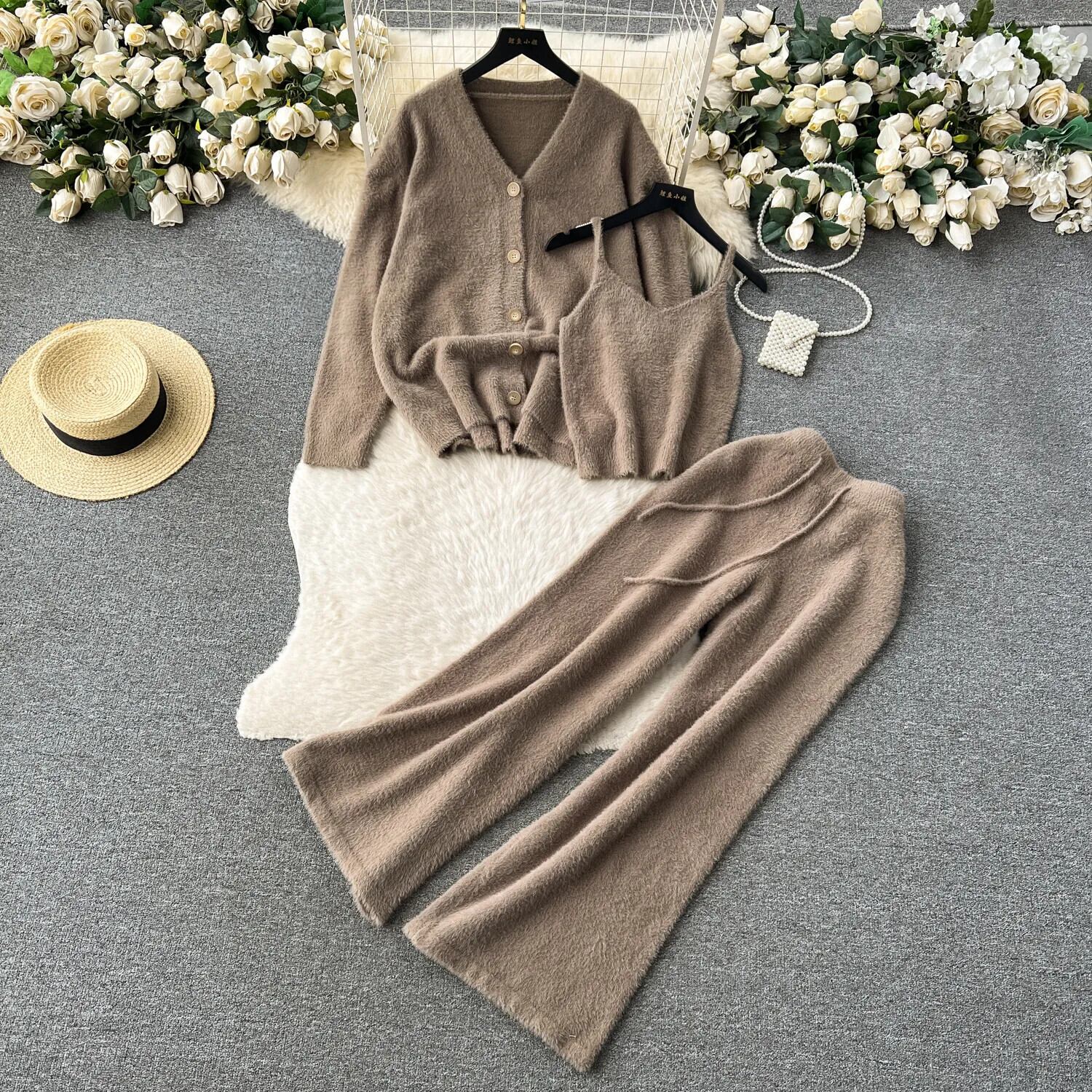 冬毛皮 3 ピーススーツシングルブレストカーディガン + ミニキャミソール + 巾着ワイド脚長パンツセット ロング ウィンター 冬物 ワイドレッグ ワイドパンツ