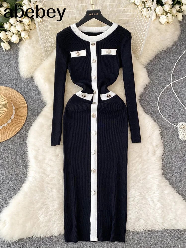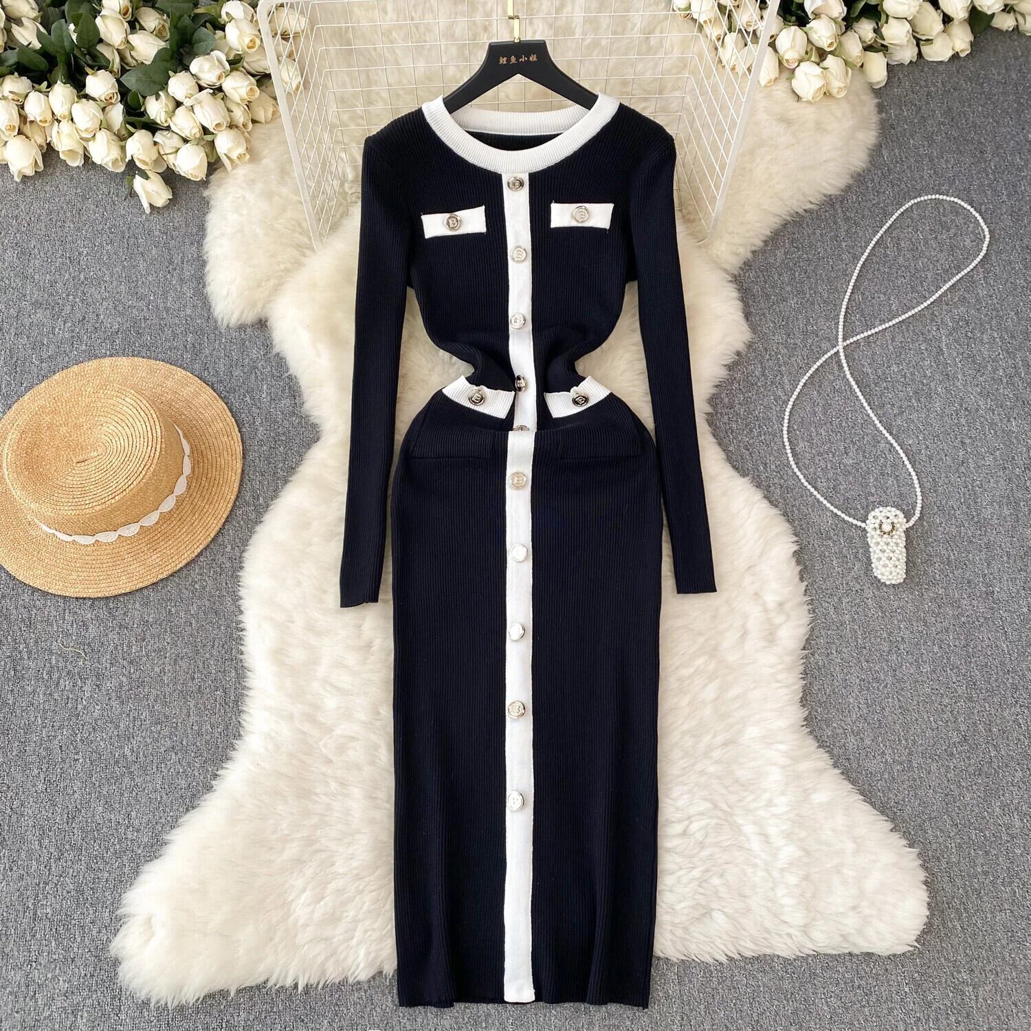 スタイルセーターロングドレスOネック長袖弾性ウエストシースオフィスレディニットマキシドレス エラスティック 伸縮 会社 学校 通勤や通学にも