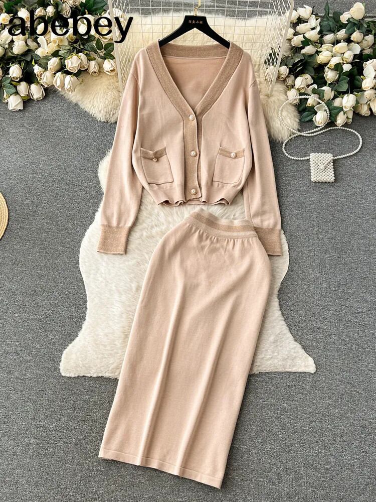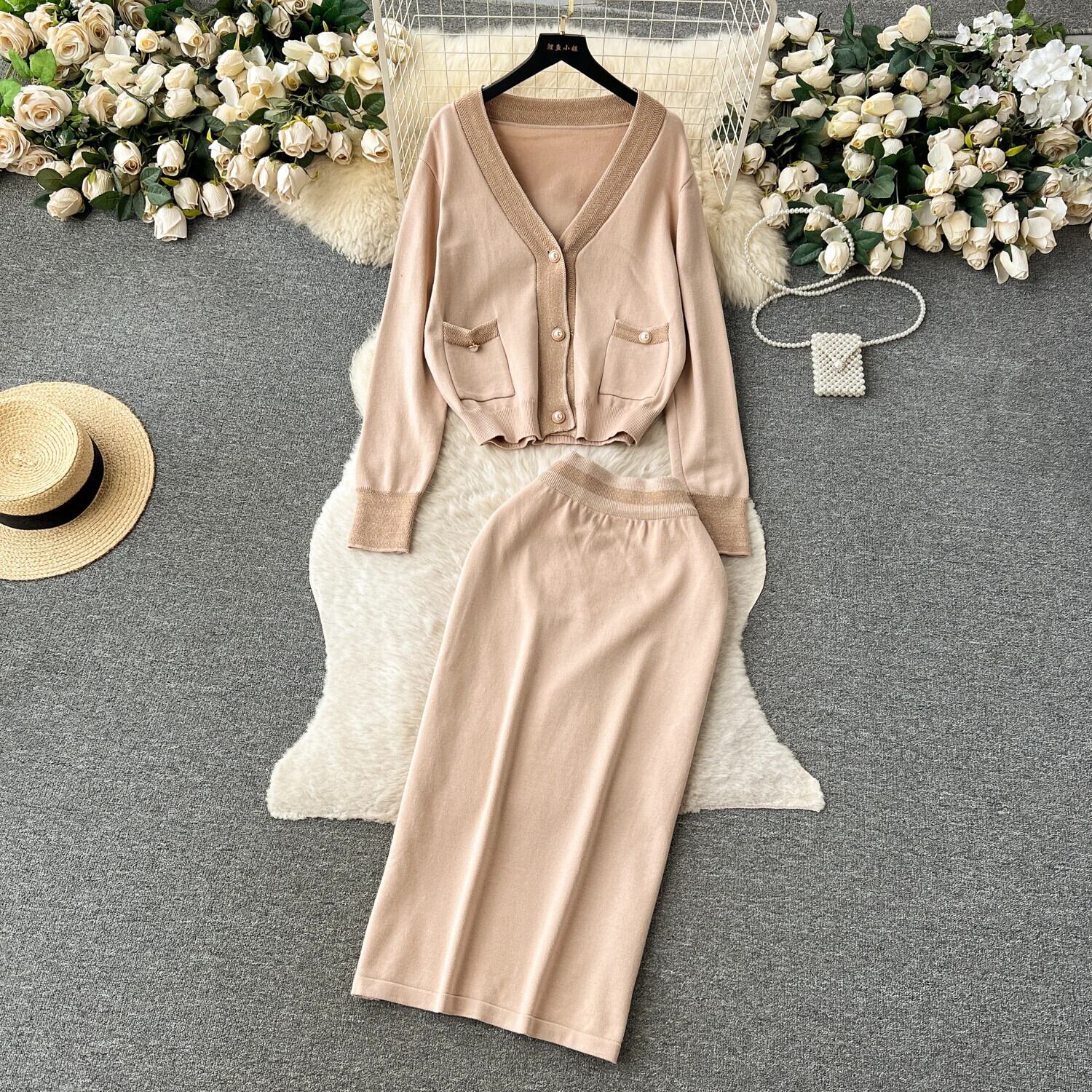 ニット 2 ピース セット レディース 装 秋冬 V ネック ブトゥーン カーディガン セーター + ミディ スカート セット オータム 秋物 ウィンター 冬物 Vネック