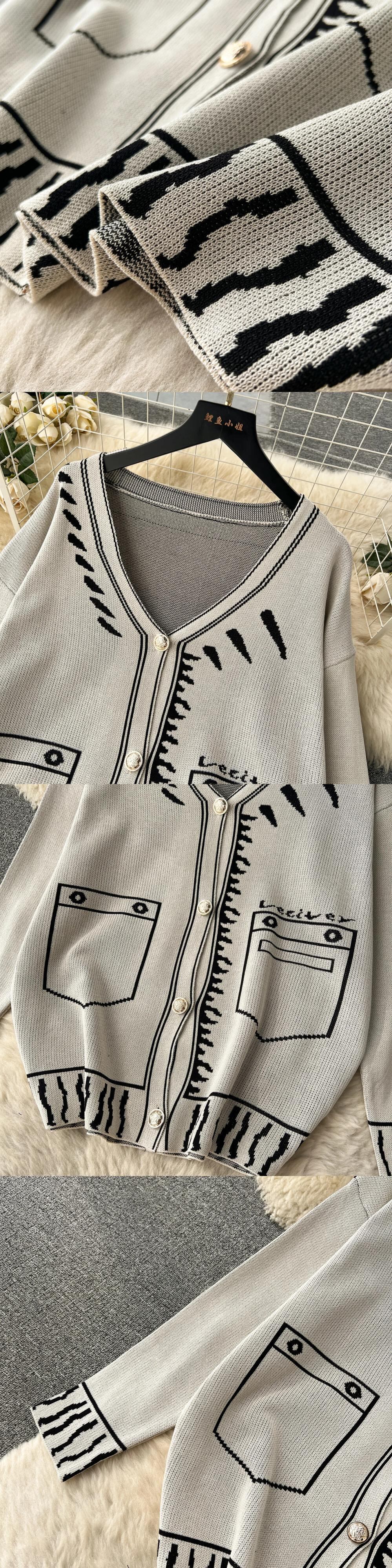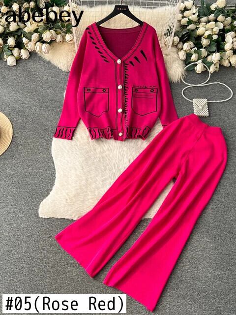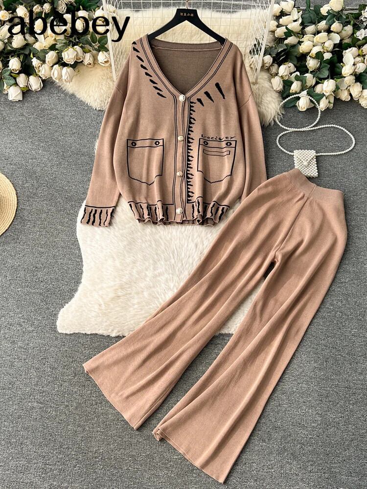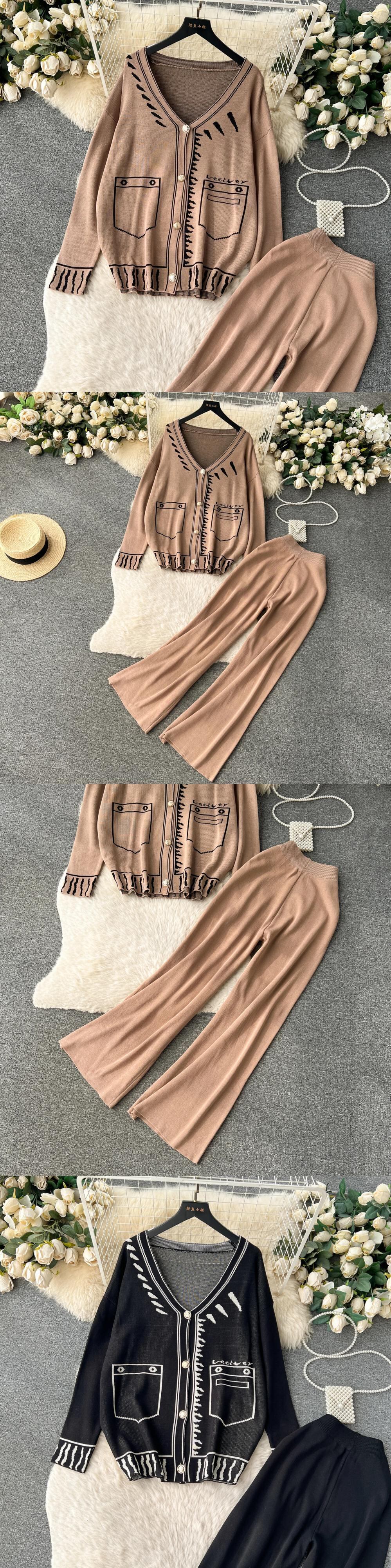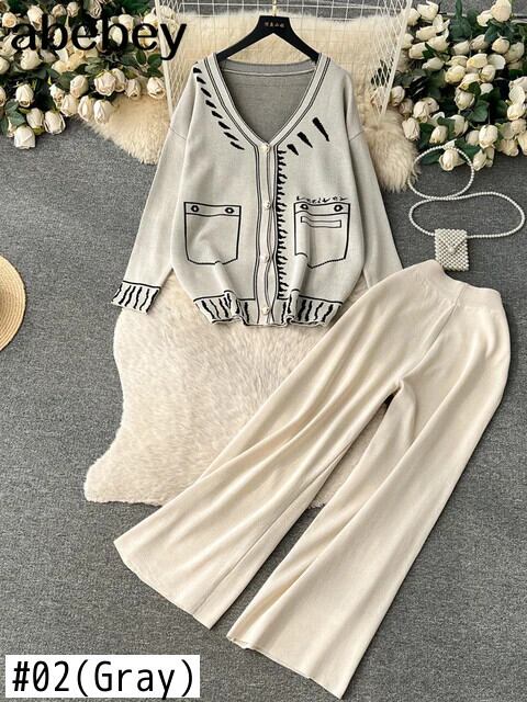 秋カラーブロック V ネックダブルポケットニットカーディガントップ + ゆったりワイドレッグパンツ 2 ピースパンツセット オータム 秋物 Vネック ワイドパンツ