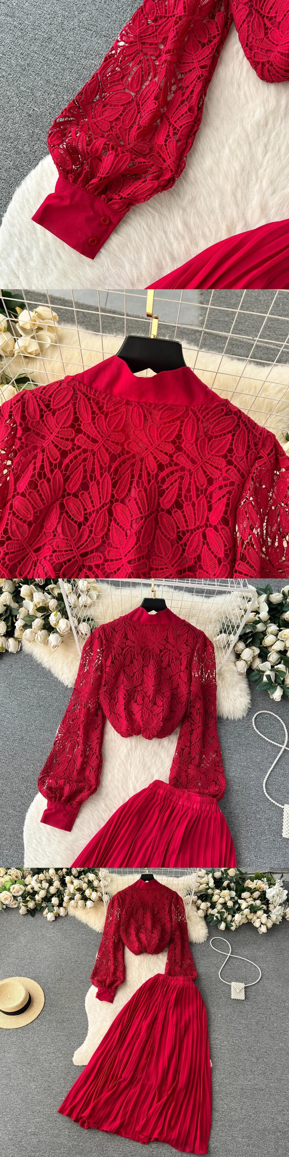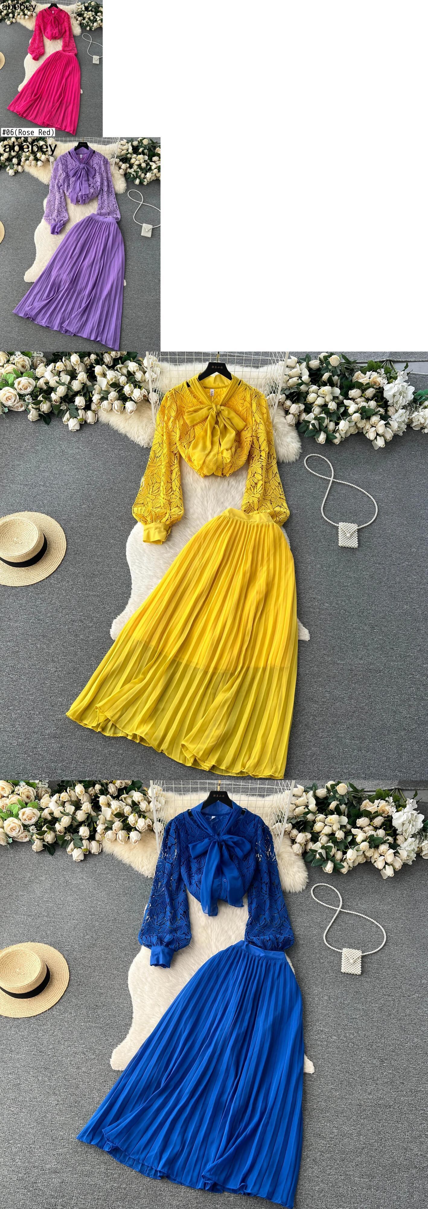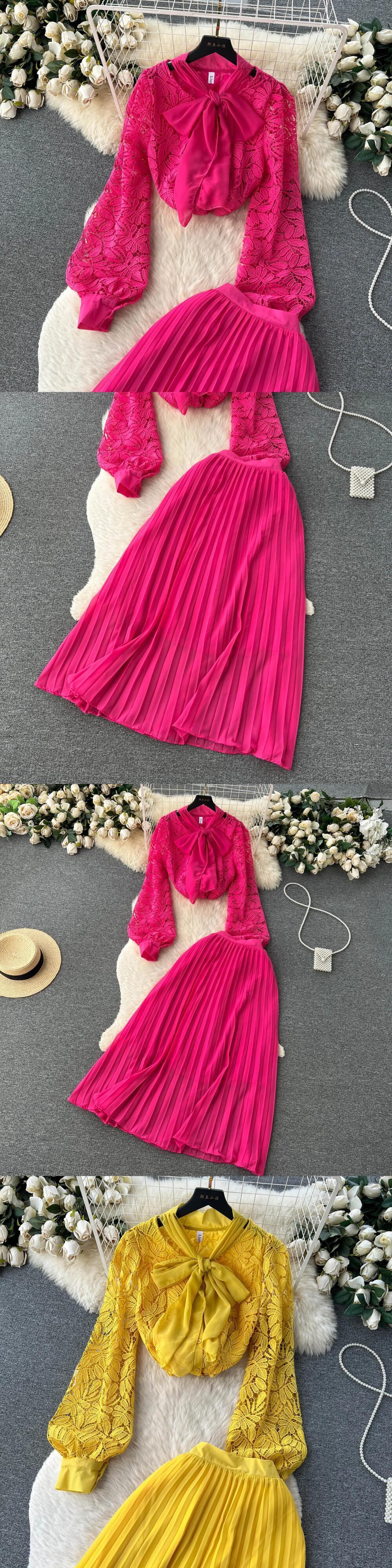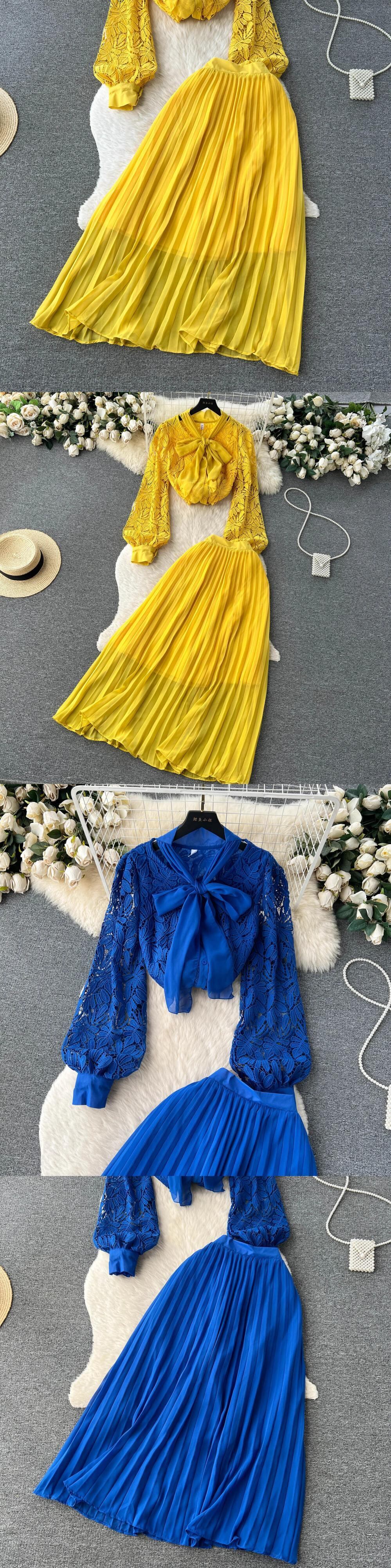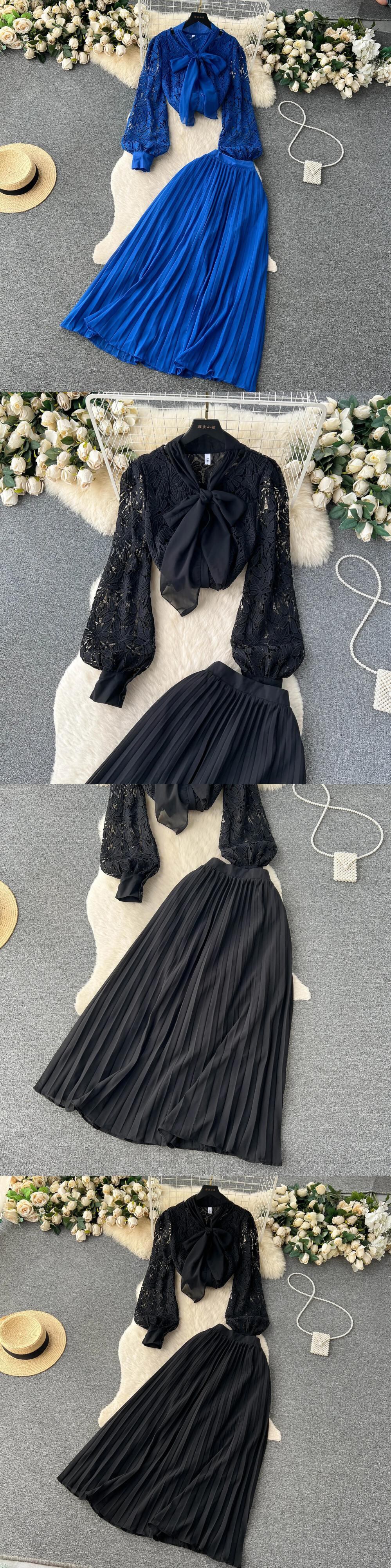 夏レースパッチワーク 2 点セット弓長袖トップス + ウエストプリーツミディスカートスーツ ロング リボン サマー 夏物