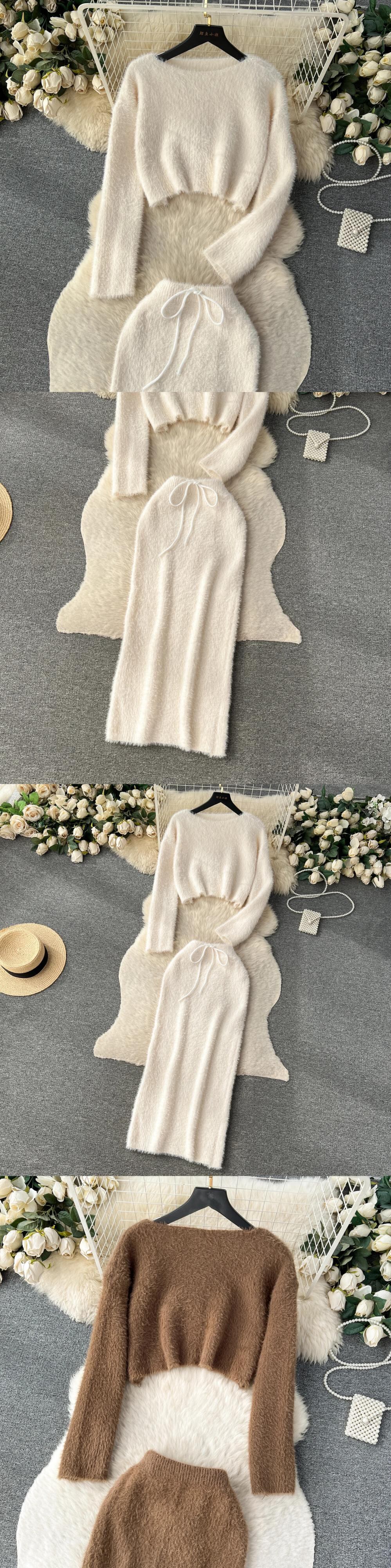 秋厚く暖かい 2 枚セット O ネック長袖ショートプルオーバー + 弾性ロングスクリットスリムセータースーツ エラスティック 伸縮 オータム 秋物 Oネック