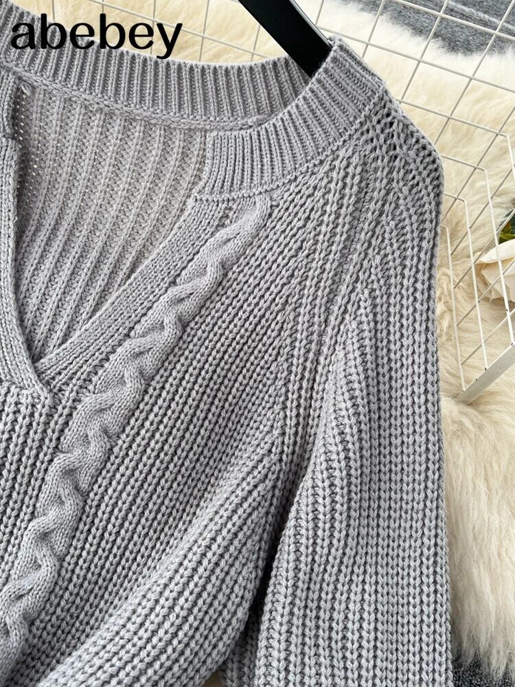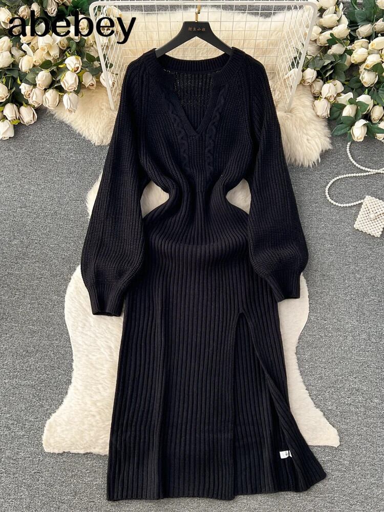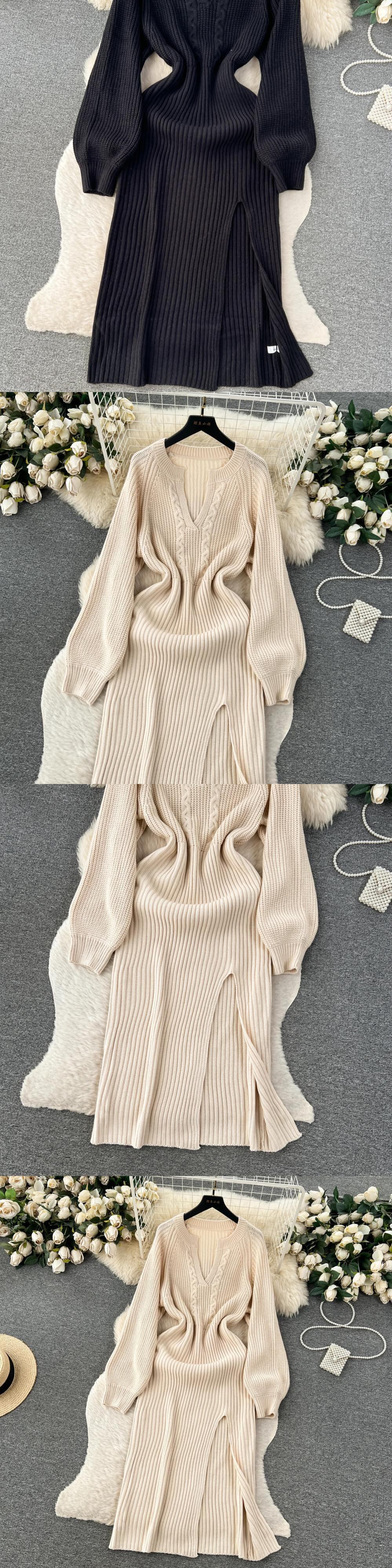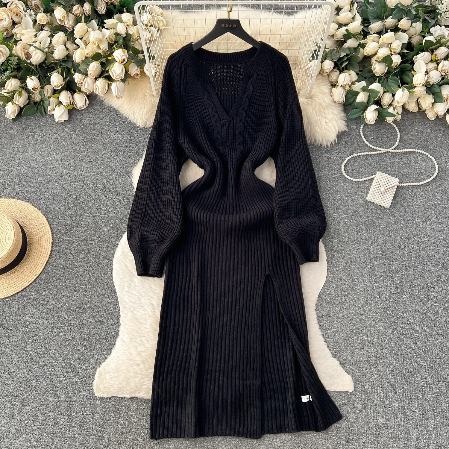 秋ニットドレスプリーツ V ネックランタンスリーブスプリット弾性ウエスト気質フレンチシニアロングドレス エラスティック 伸縮 オータム 秋物 Vネック