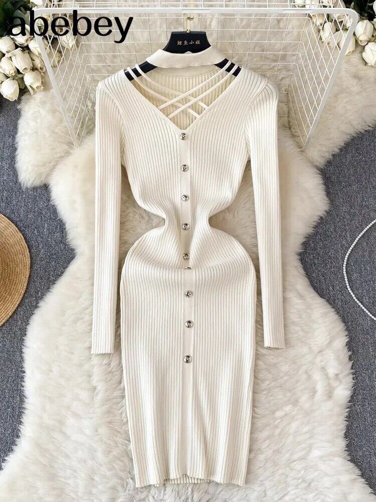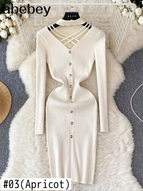 秋セーターロングドレスクロスボタンストリート弾性ウエストスリムセクシーニットドレス エラスティック 伸縮 オータム 秋物