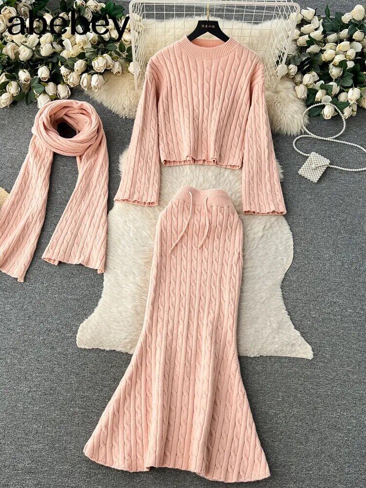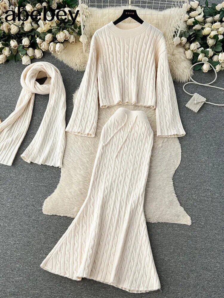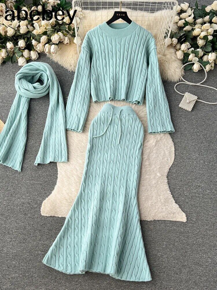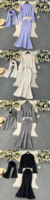 秋ニット 2 枚セットショートスリムプルオーバー + ウエストゴムマーメイドロングスカートシースセクシーセータースーツ エラスティック 伸縮 オータム 秋物