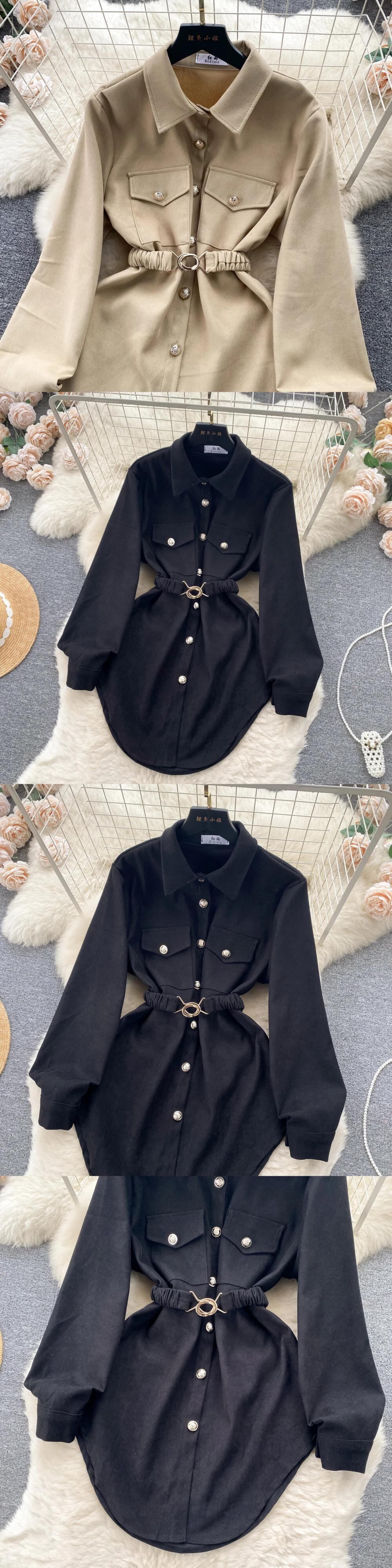 長袖プリーツデザインソリッドミニシャツドレスオフィスシックベルト裾スリム Vestidos ロング ハーネス ソリッドカラー 会社 学校 通勤や通学にも