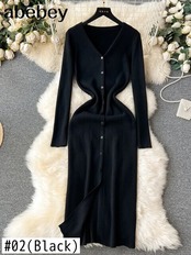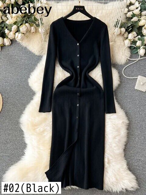 ニットセーター長袖ドレススリムボディコン秋冬ボタン V ネックセーターミディドレス ロング ウィンター 冬物 Vネック