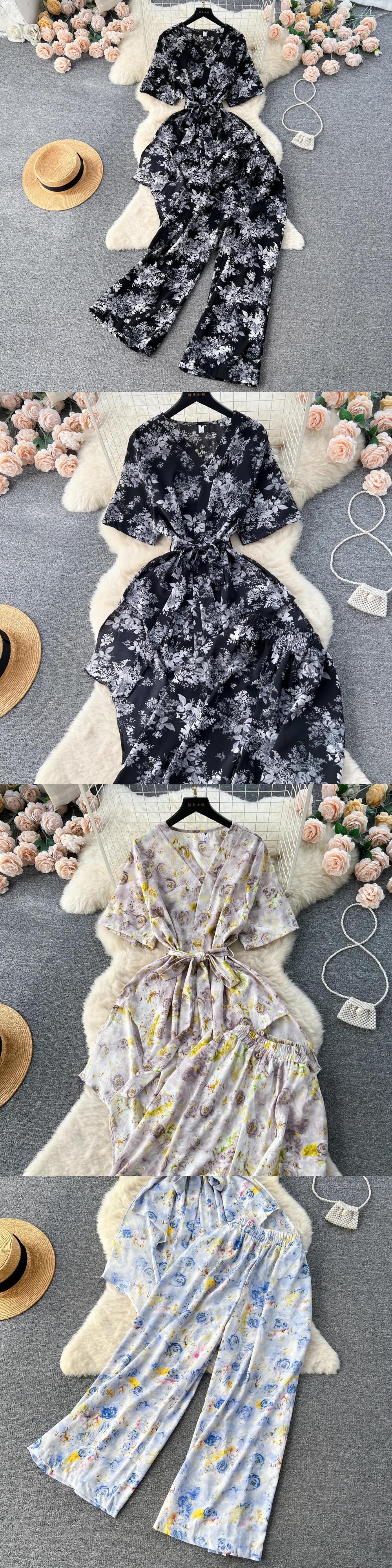 夏セットトレンディプリント V ネックレースアップベルト半袖シャツ + ウエストゴムシックスーツ ショート ハーフスリーブ エラスティック 伸縮 サマー 夏物 ハーネス Vネック