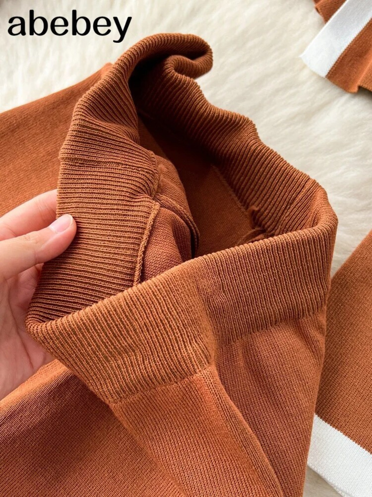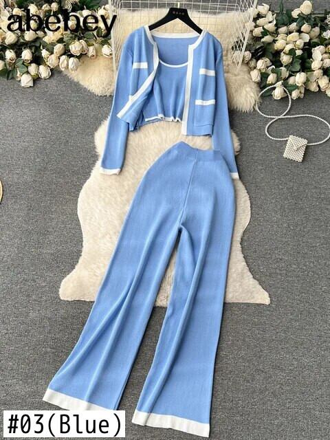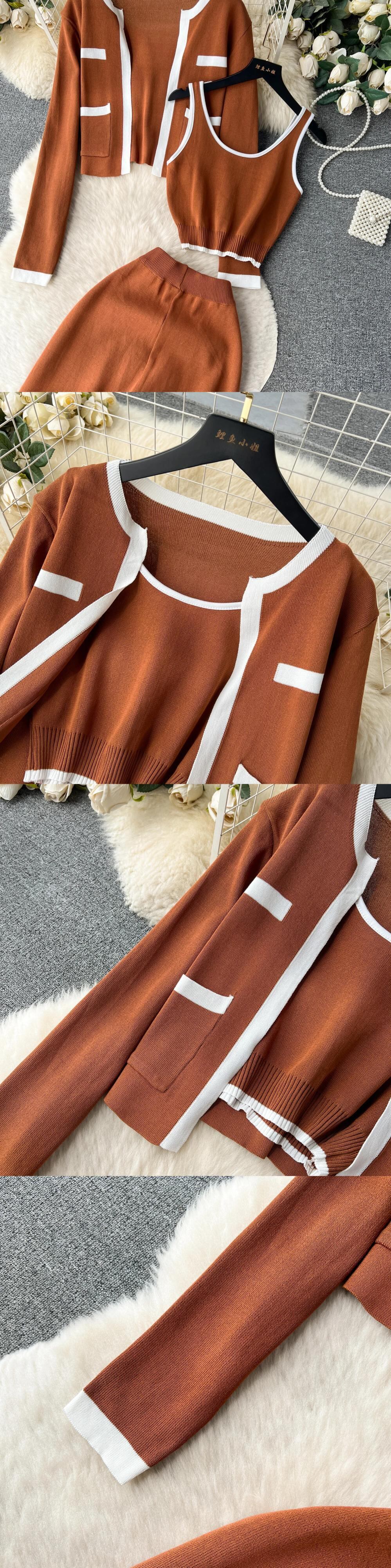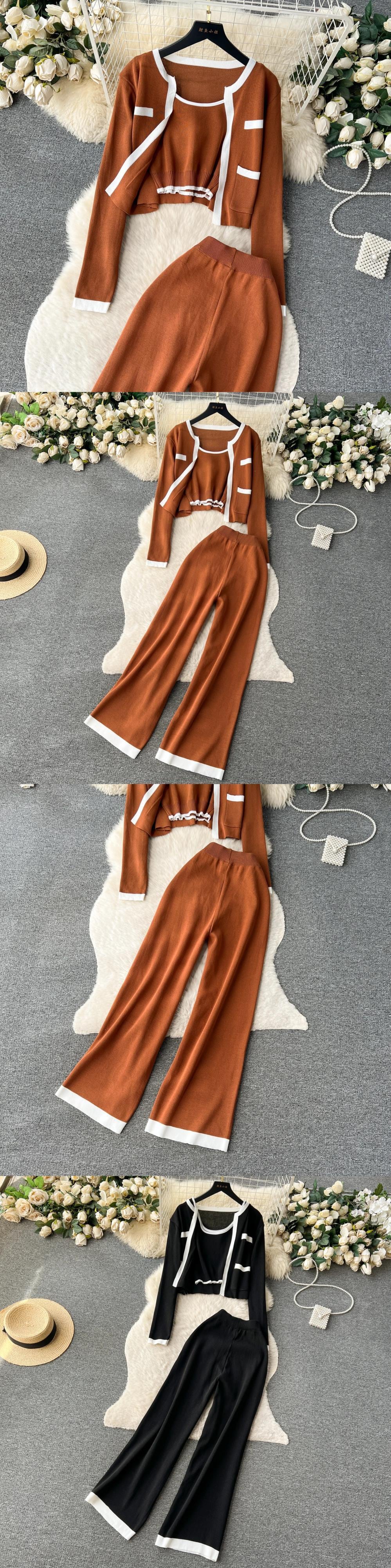 秋ニット 3 点セットスリムタンクトップ + 長袖ショートカーディガン + 弾性長ズボンセーターセット ロング エラスティック 伸縮 オータム 秋物