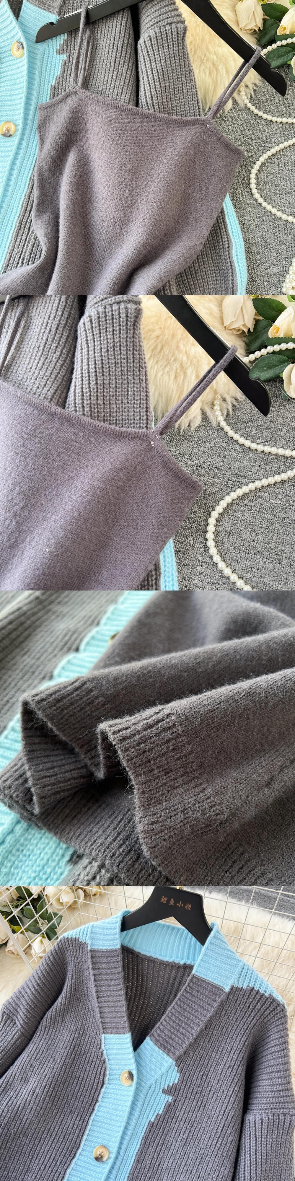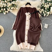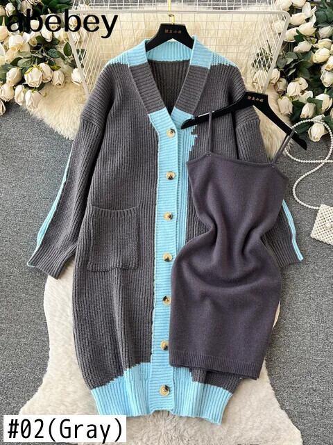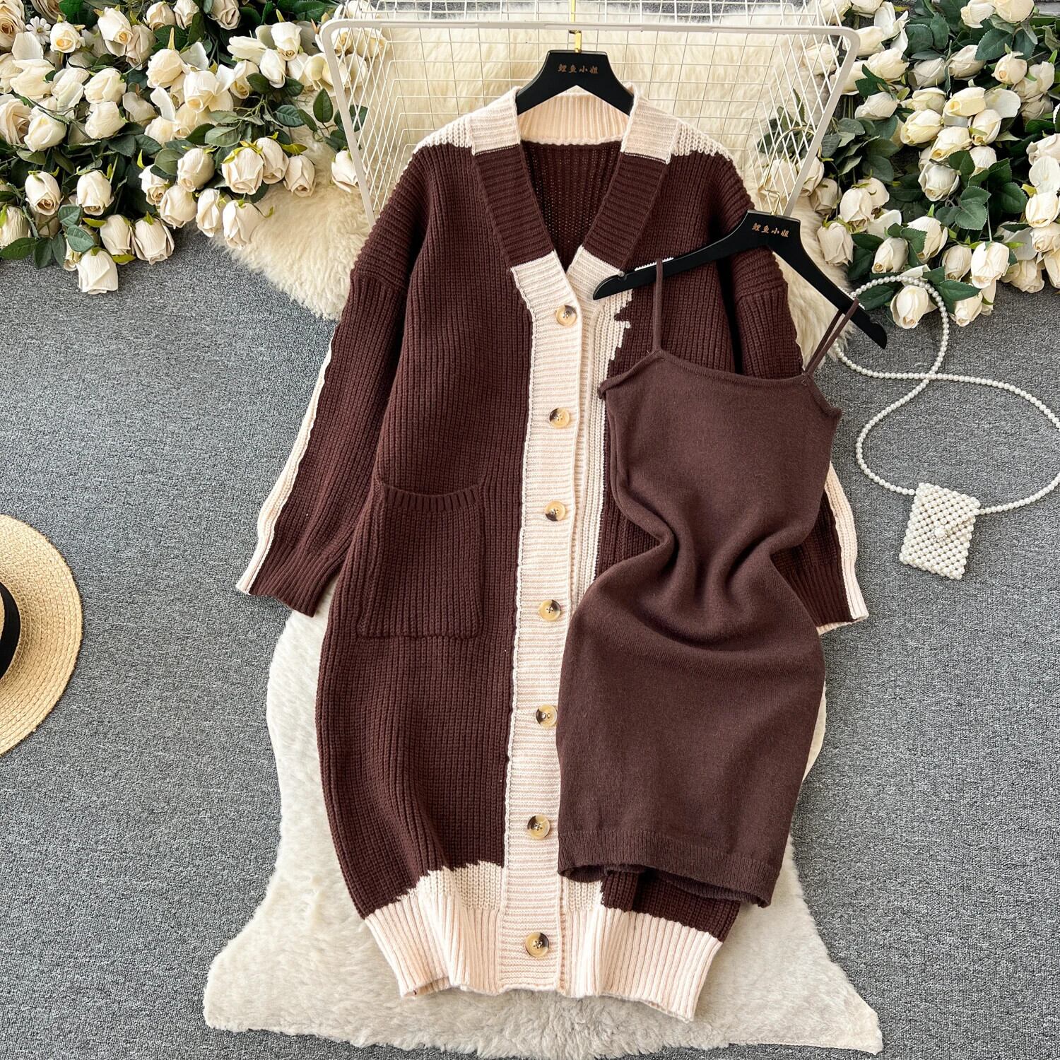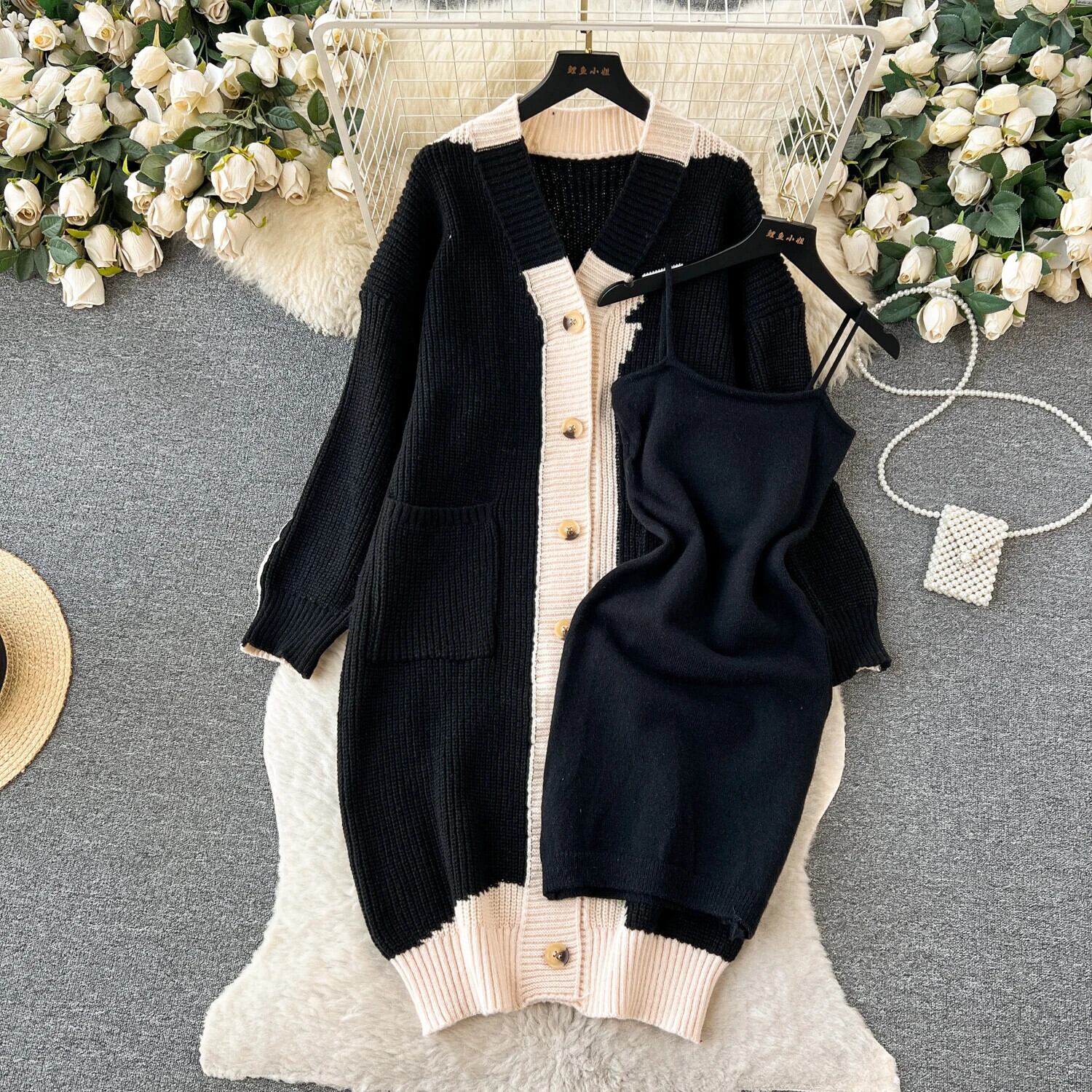 セータースーツ秋長袖ルーズカーディガン+ストラップショートドレスパッチワークニット2点セット ロング オータム 秋物