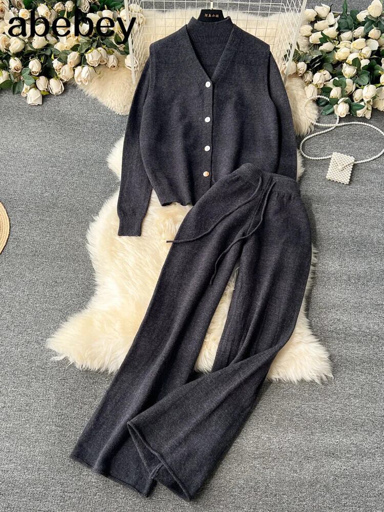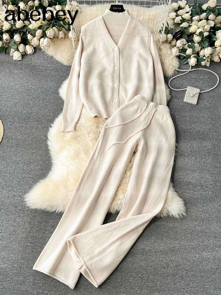 ルーズセーター 3 枚セットニットベスト + ロング暖かいカーディガン + ワイドレッグロングパンツ厚いニットスーツ ワイドパンツ ソリッドカラー