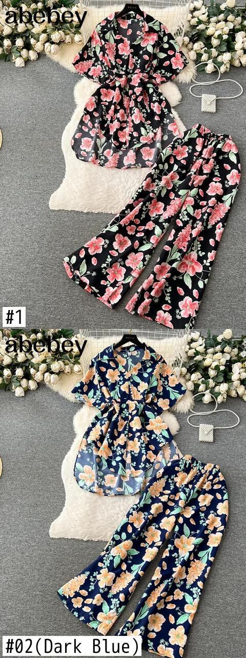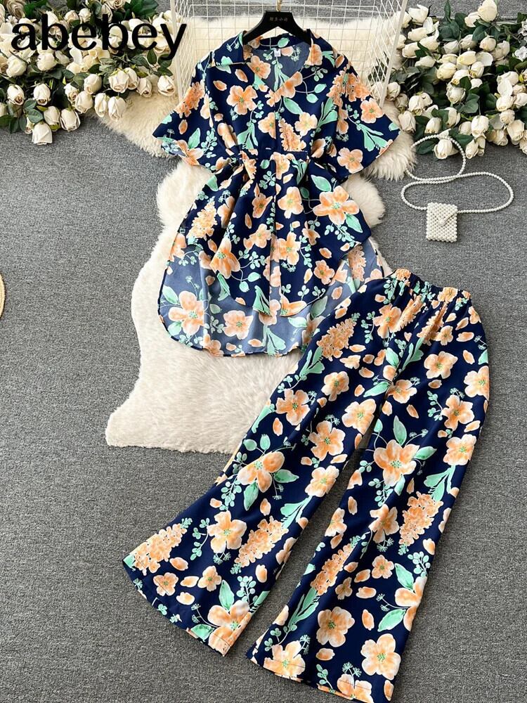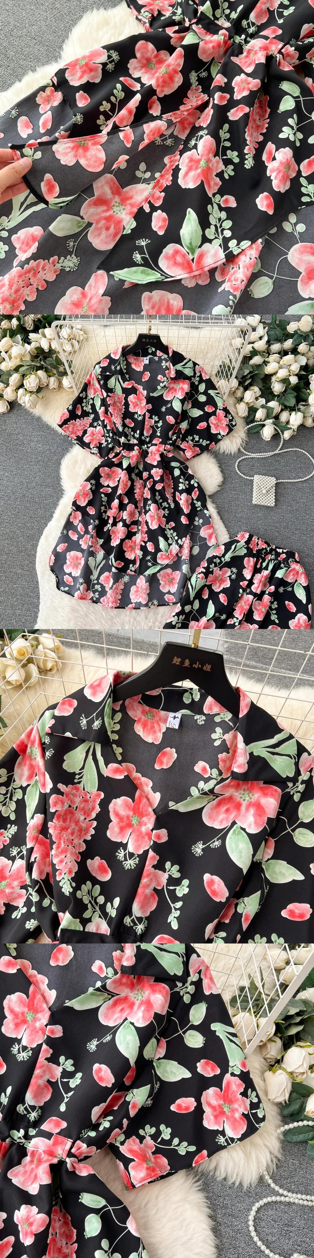グラデーションパンツセット半袖ボタンアップシャツ+夏プリント花柄ルーズパンツスーツ ショート ハーフスリーブ サマー 夏物