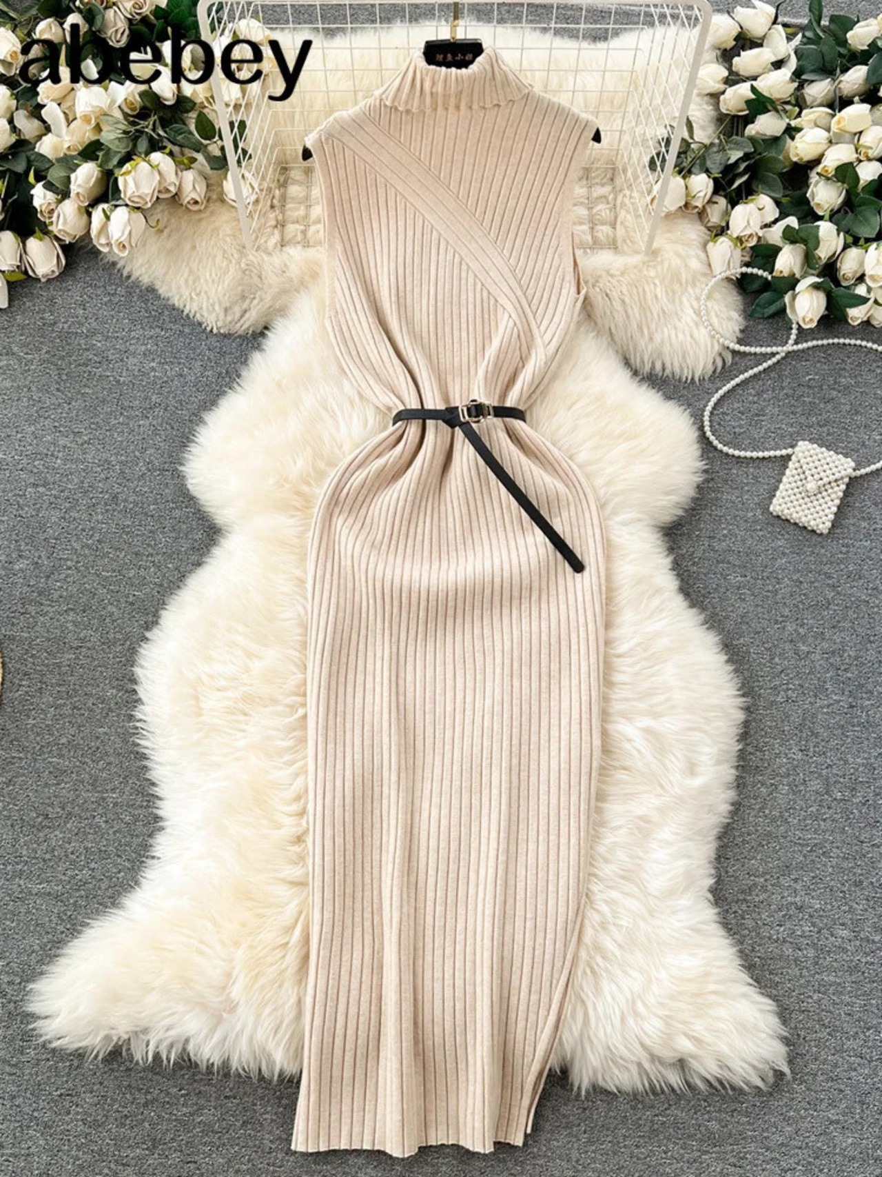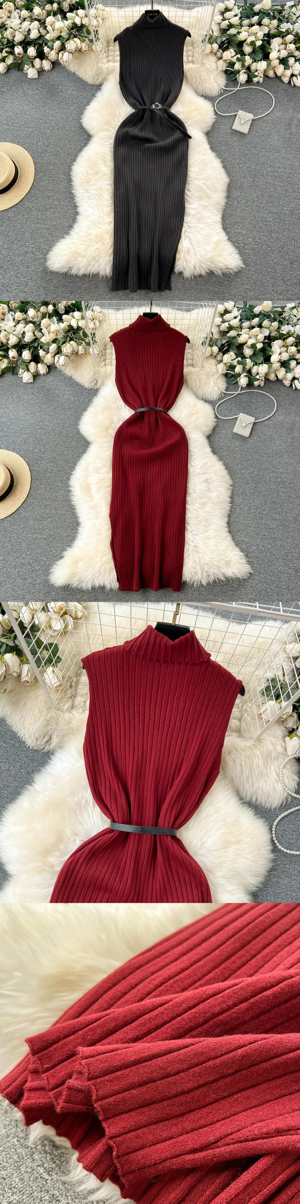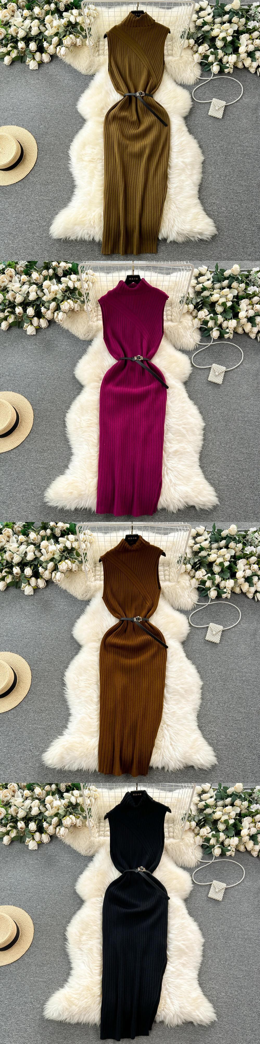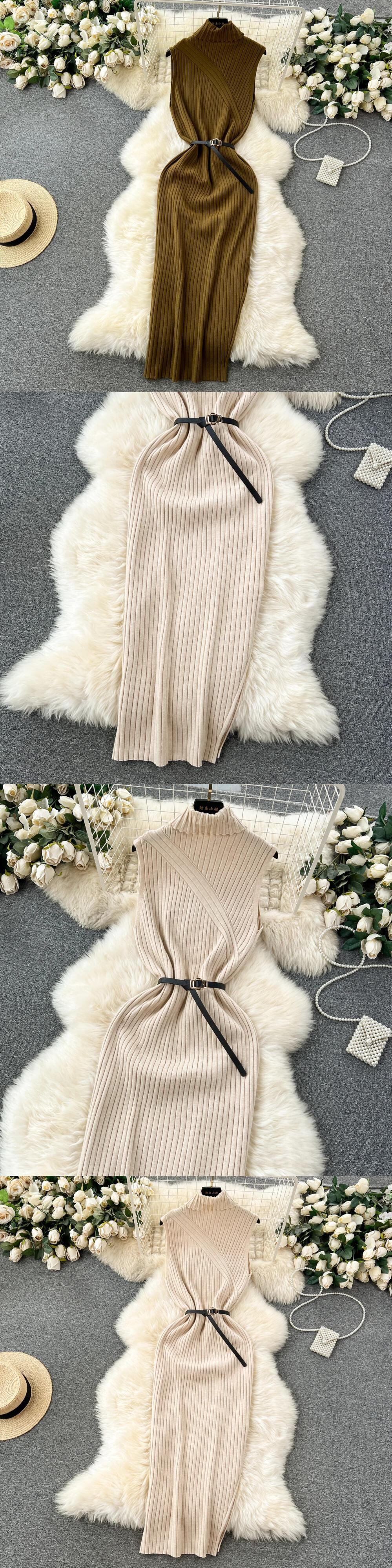 シンプル長袖ノースリーブタートルネックボディコンドレスベルト秋冬ニットリブラップマキシロングペンシルドレス ウィンター 冬物 ハーネス