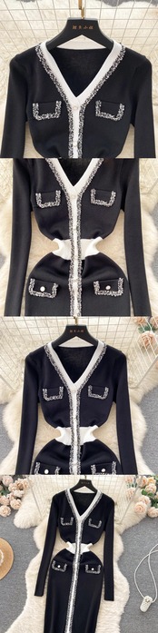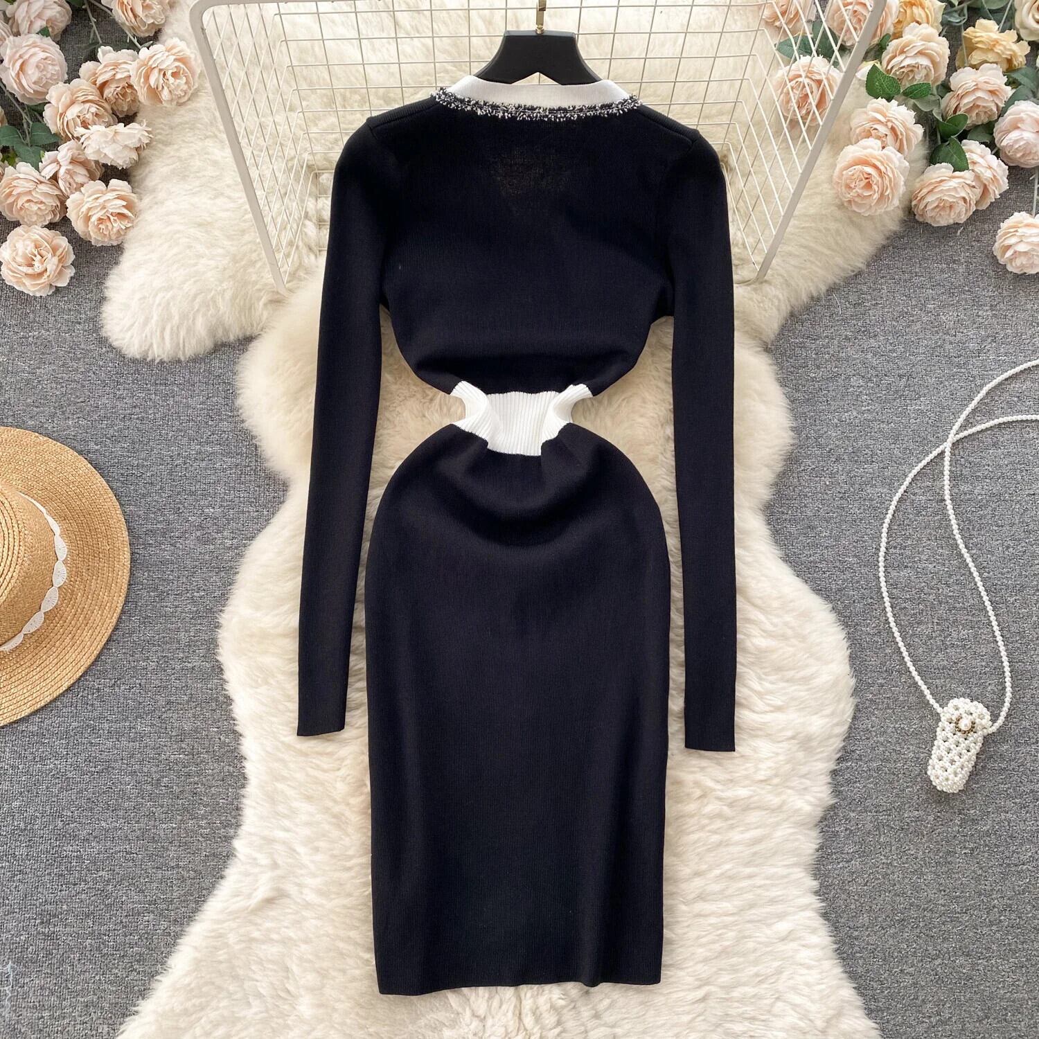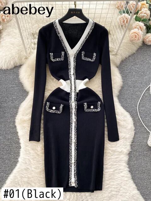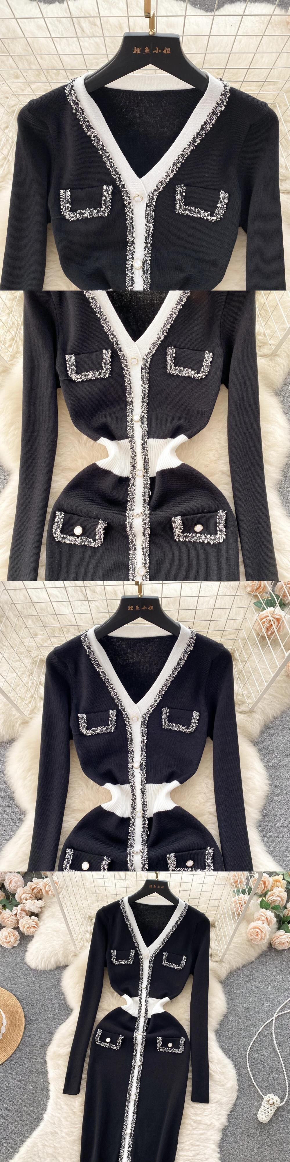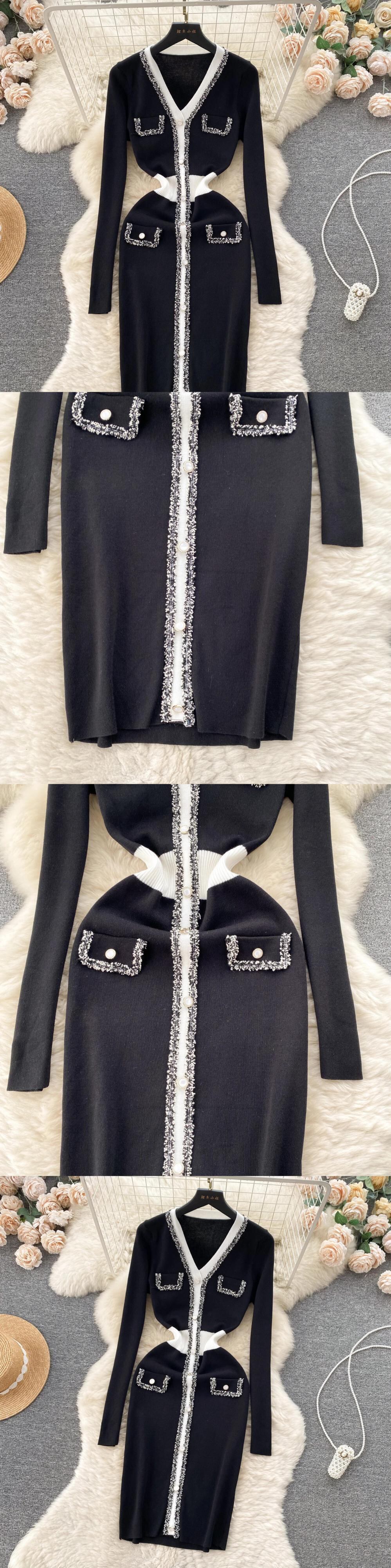 ニットミディドレス V ネックパッチワーク長袖スリムフィットアメリカンレトロストリートボディコンドレス ロング Vネック