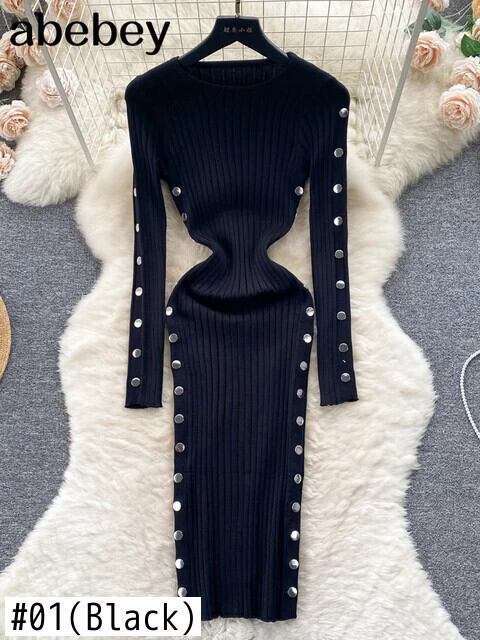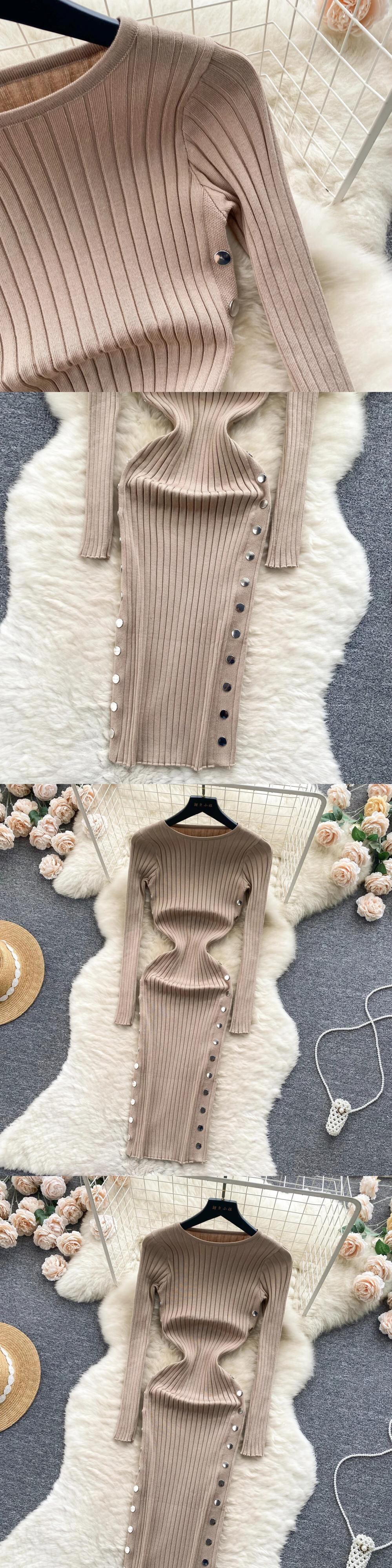フレンチソリッドニットロングドレスOネック弾性ウエストボタン気質秋セクシースリムミディドレス エラスティック 伸縮 オータム 秋物 ソリッドカラー