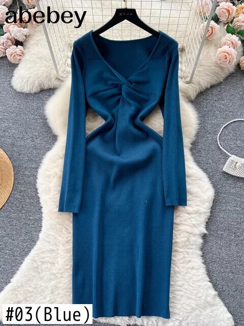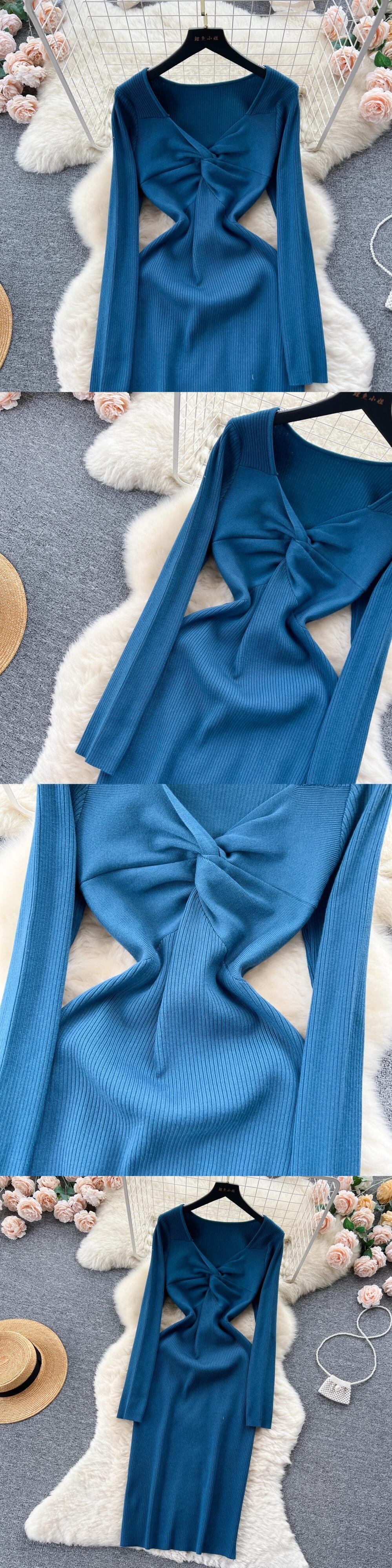 秋シックニットドレスソリッド V ネックキンク長袖フランススプリットセーター OL パーティードレス ロング オータム 秋物 Vネック ソリッドカラー