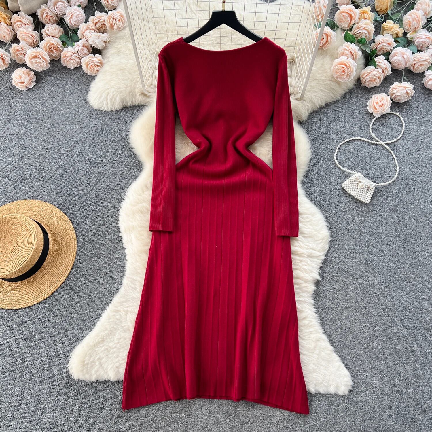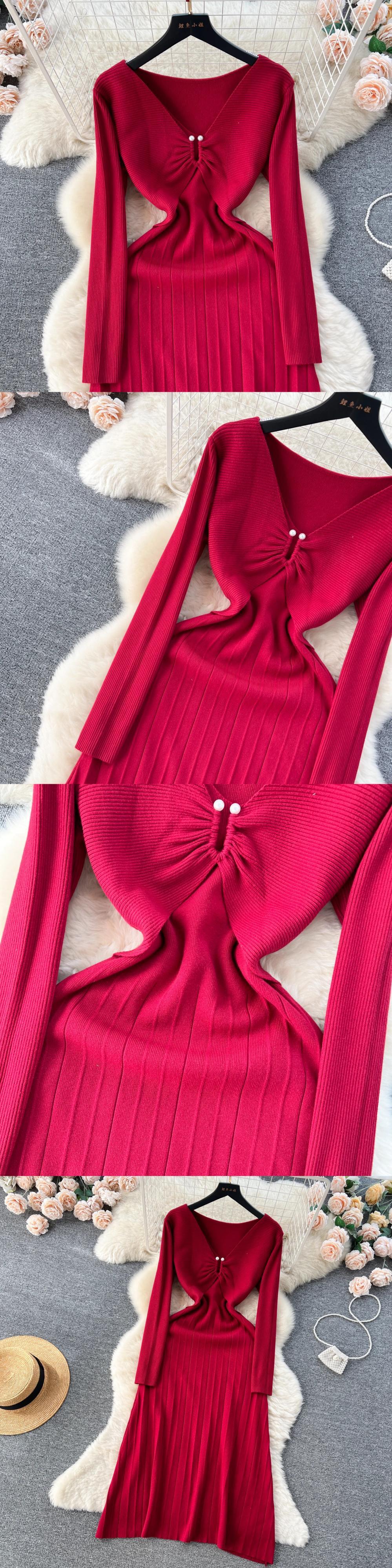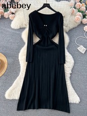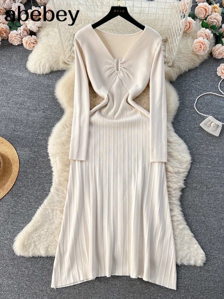 フランス優しい秋ドレス V ネックシャーリングアウト形長袖スキニーレトロプリーツ A ラインドレス ロング オータム 秋物 Vネック Aライン