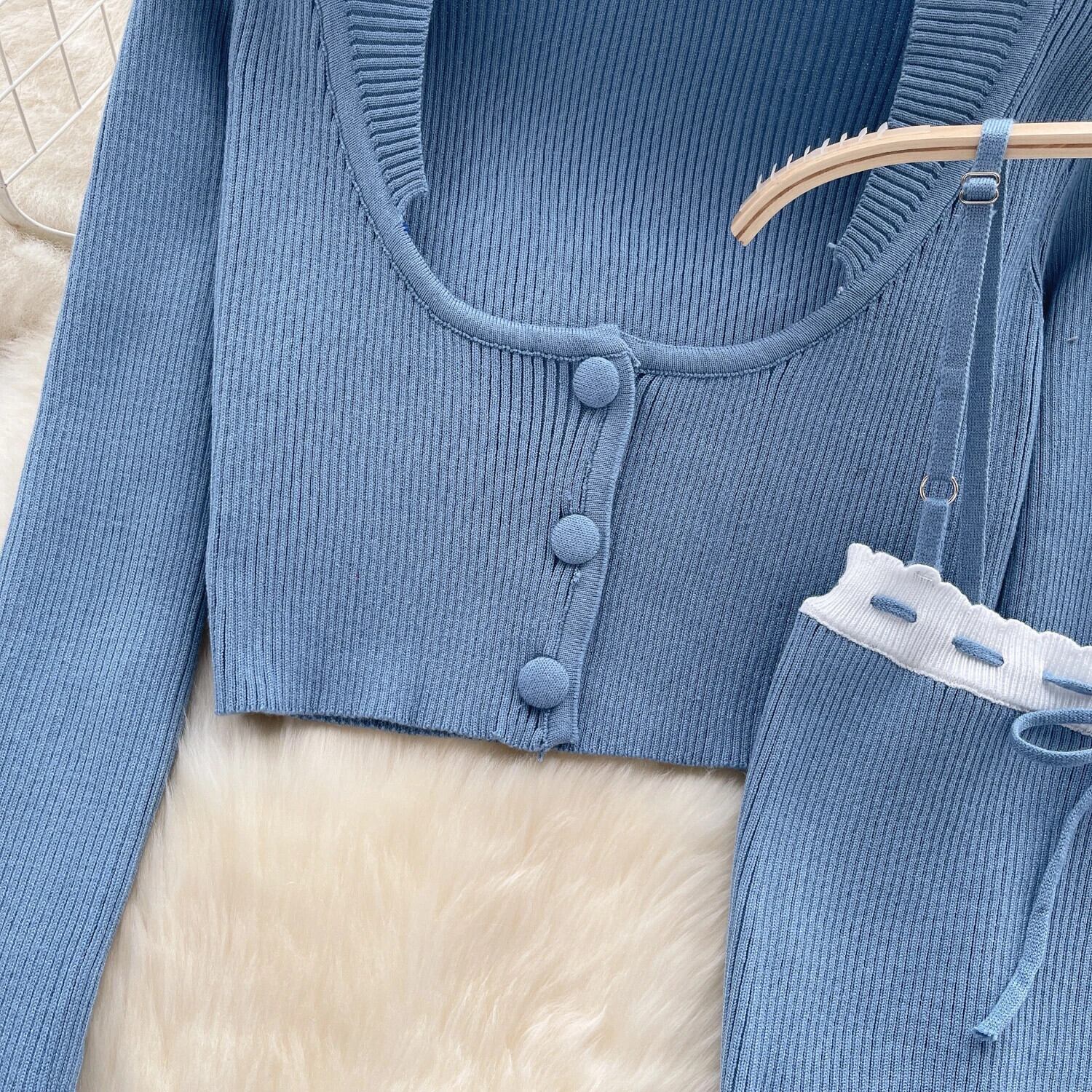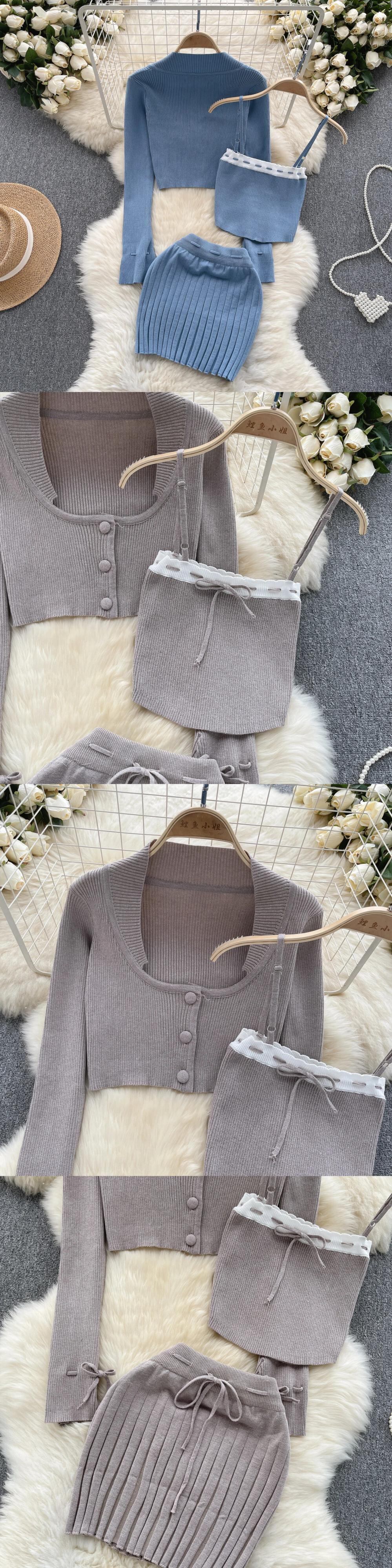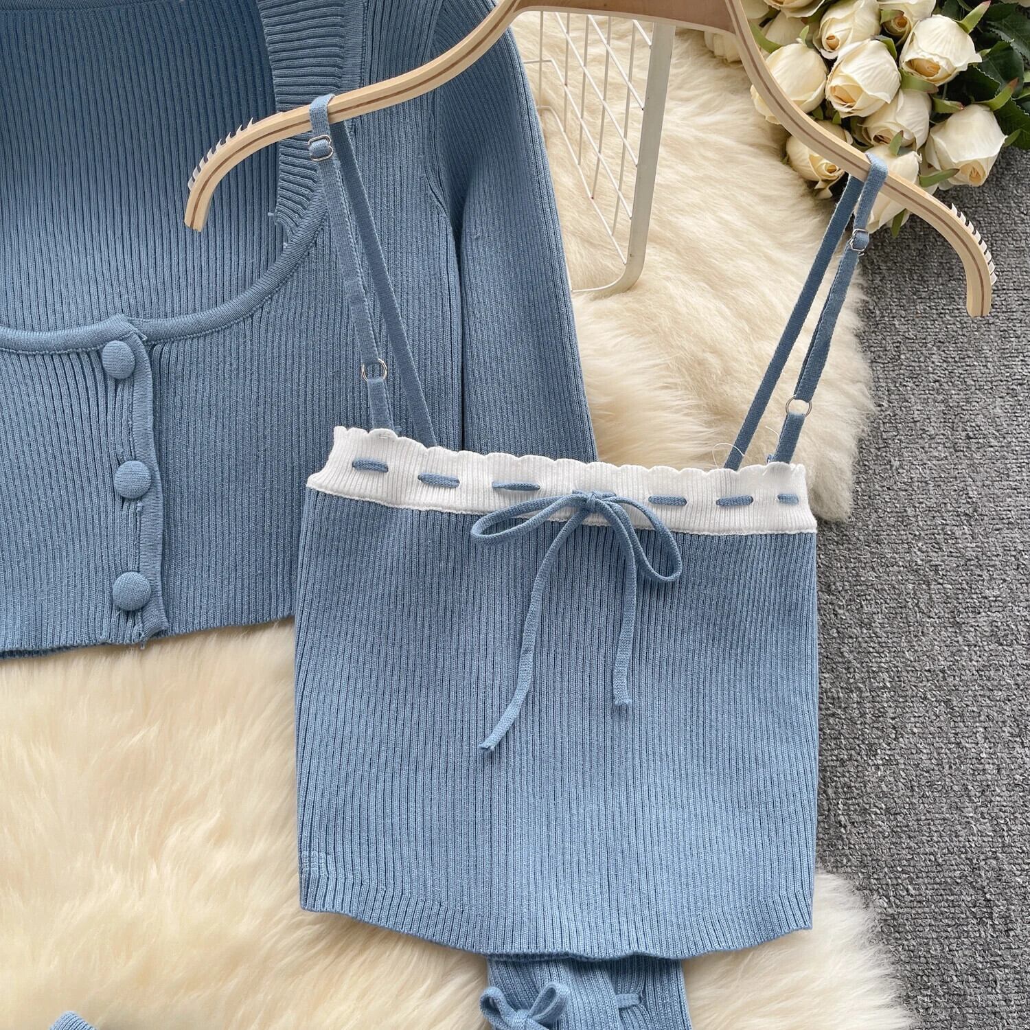 秋スリムニット 3 点セットショートカーディガン + ミニスカート + ストラップニットキャミソール暖かい厚いセータースーツ オータム 秋物