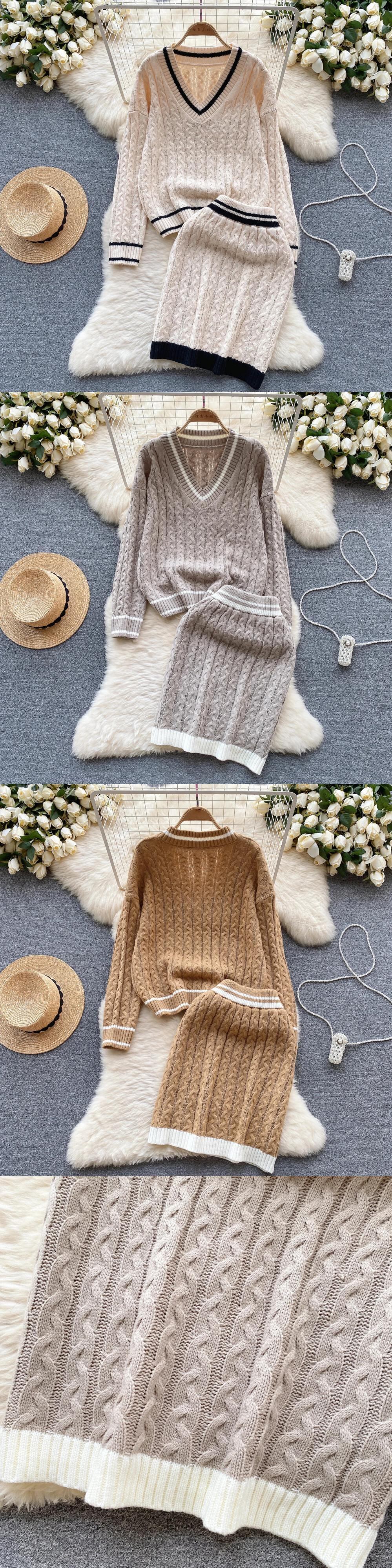 プレッピースタイルセーター 2 枚スーツ V ネックルーズプルオーバー + ショートスカート秋暖かいニットセット オータム 秋物 Vネック