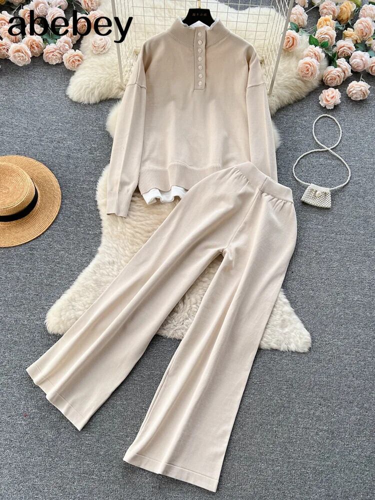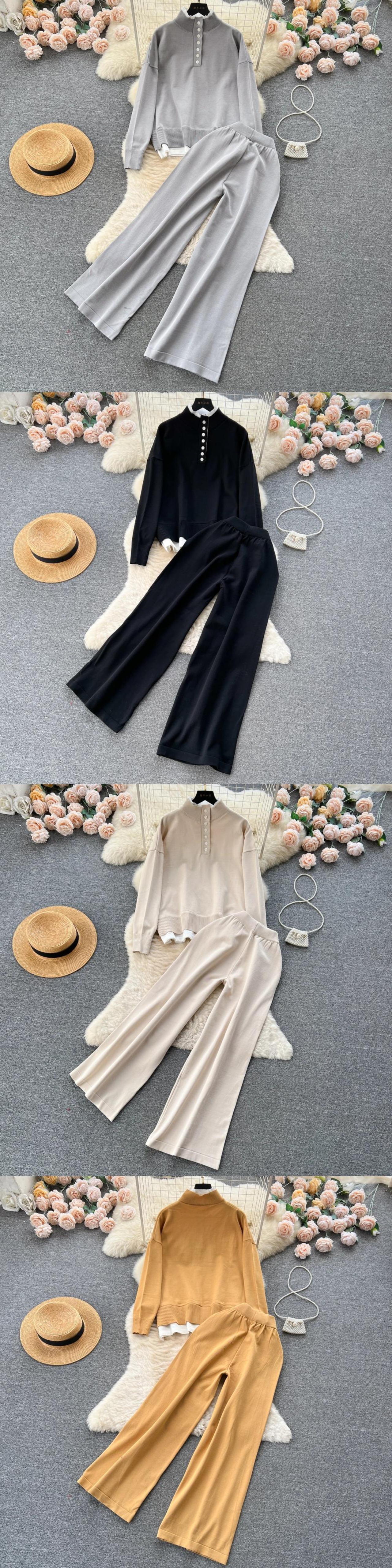 秋ニットセットフルスリーブルーズスプリットプルオーバー+ワイドレッグロングパンツホームセータースーツ オータム 秋物 ワイドパンツ