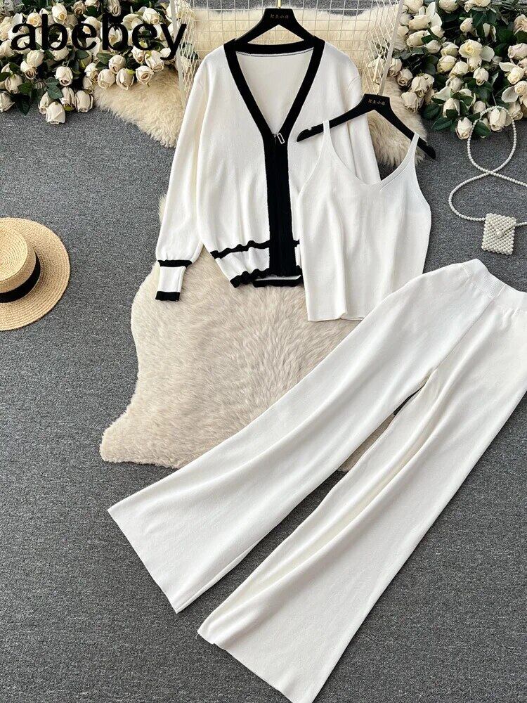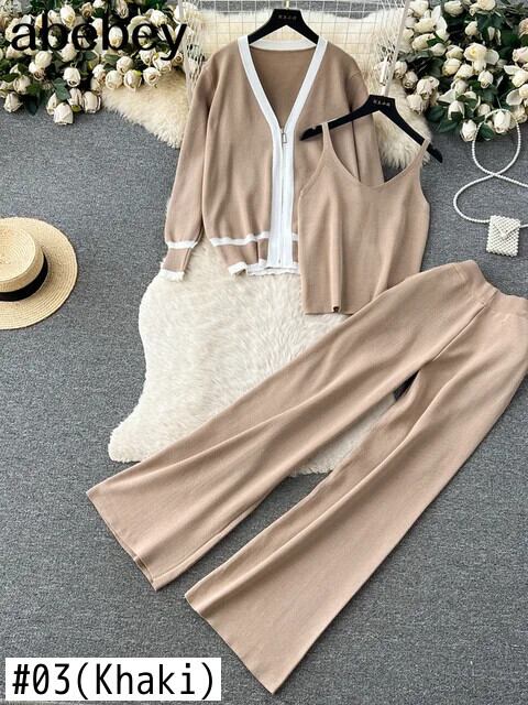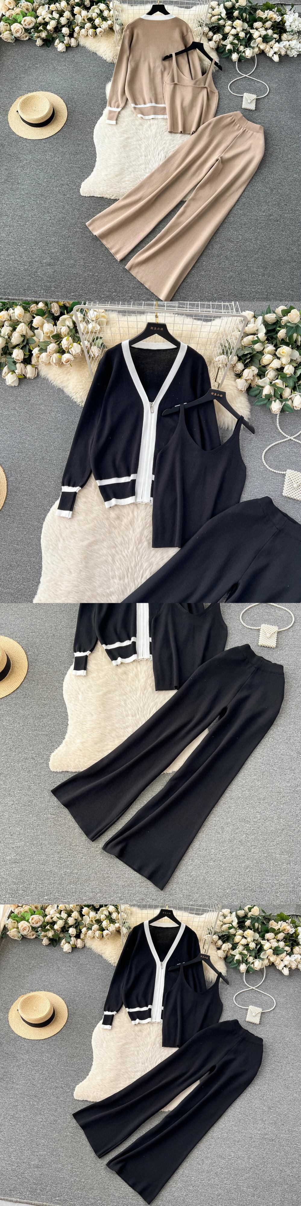 春秋 3 ピースカーディガンジャージニットポケットパンツセットセータースーツ スプリング 春物 オータム 秋物