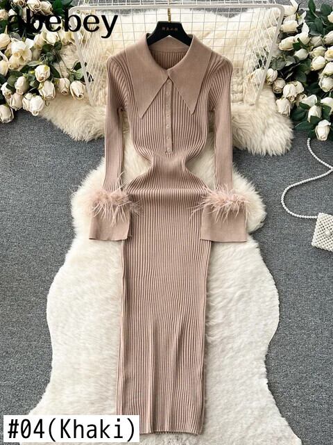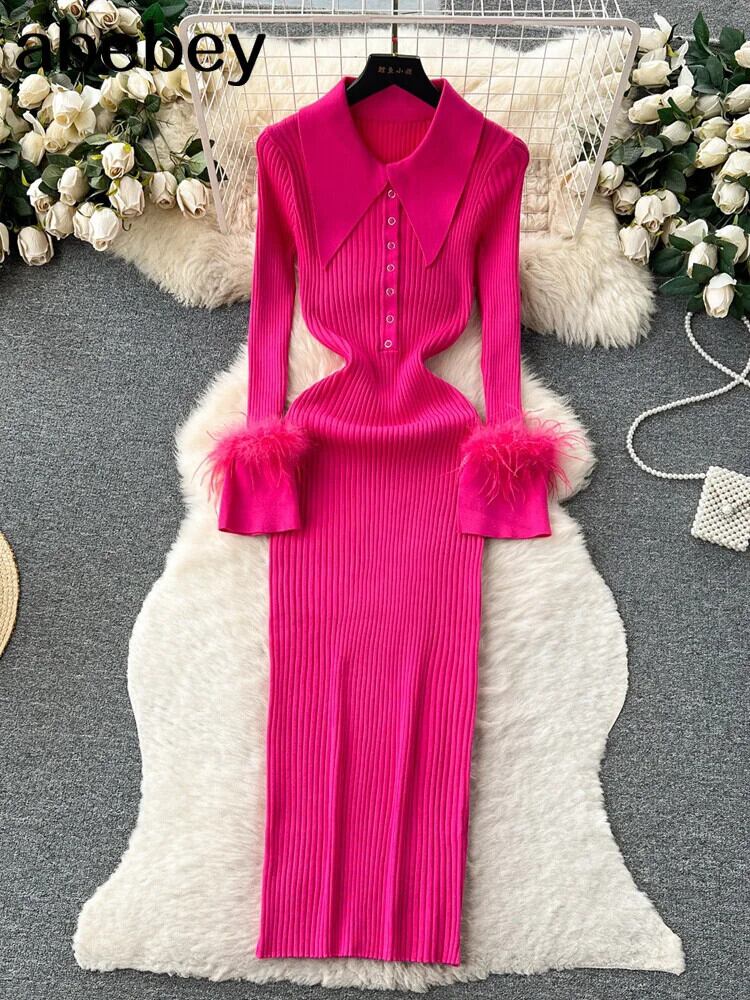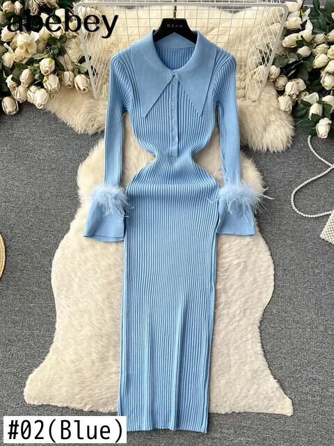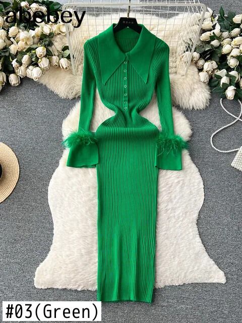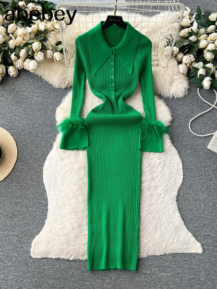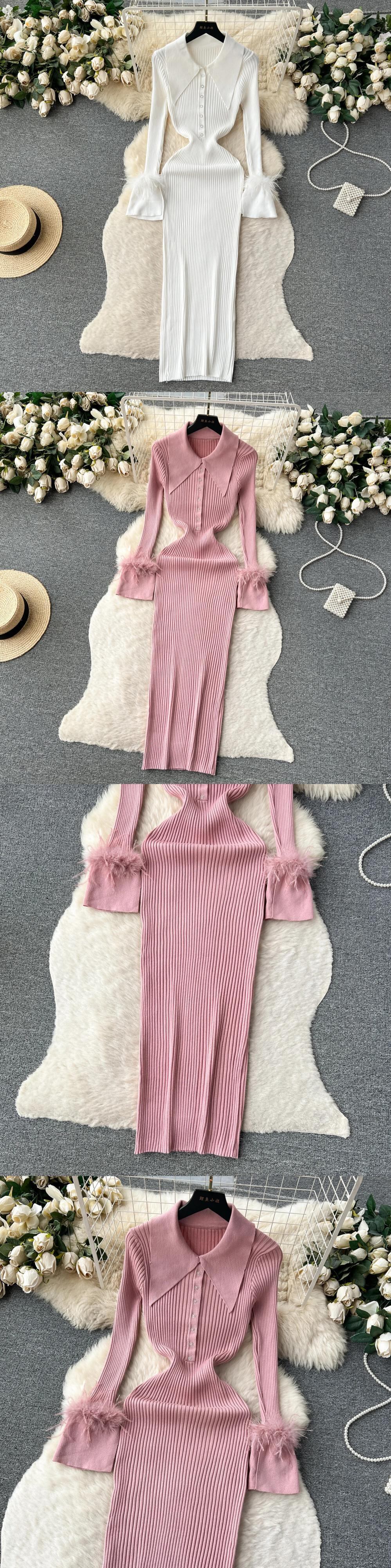 ポロカラーマキシドレスフェザーフレアスリーブシングルブレストロングベストストリート