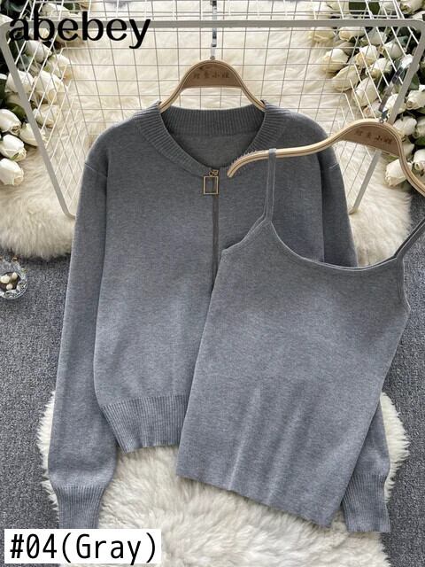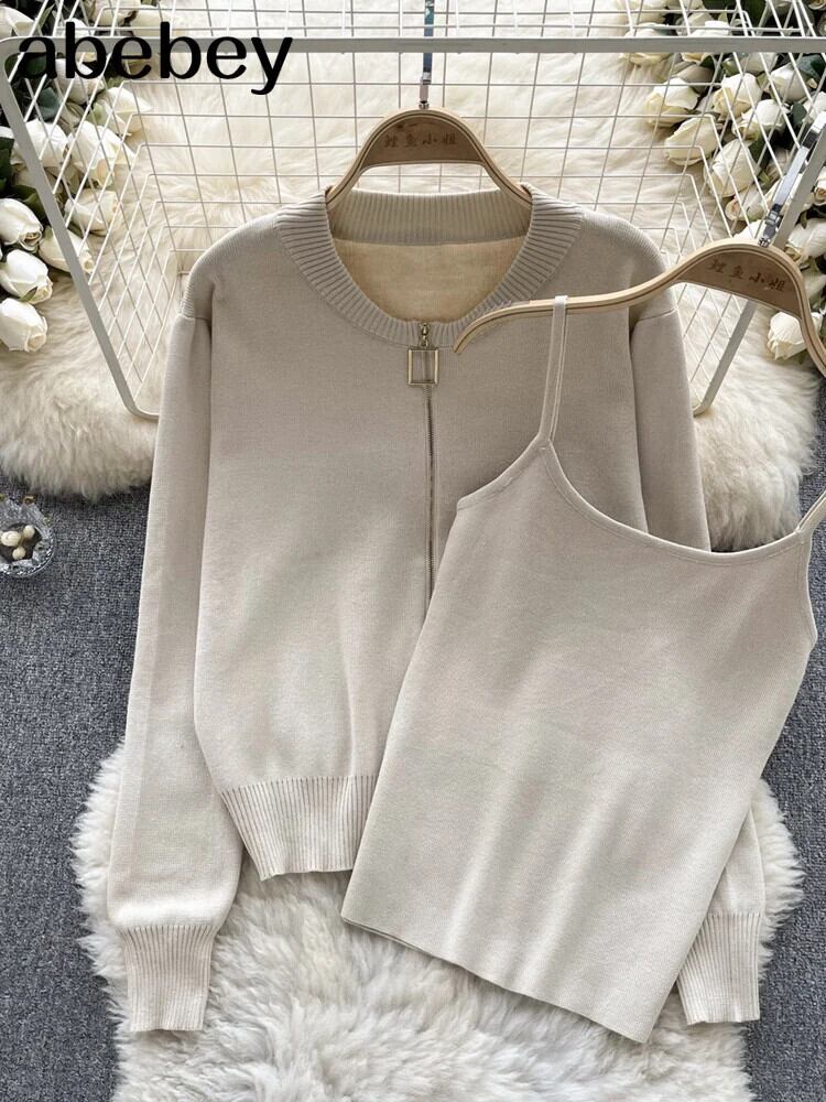 秋ニットツーピーススーツ o ネックジップルランタンスリーブクロップドルーズカーディガン + キャミソールソリッドセット オータム 秋物 Oネック ソリッドカラー