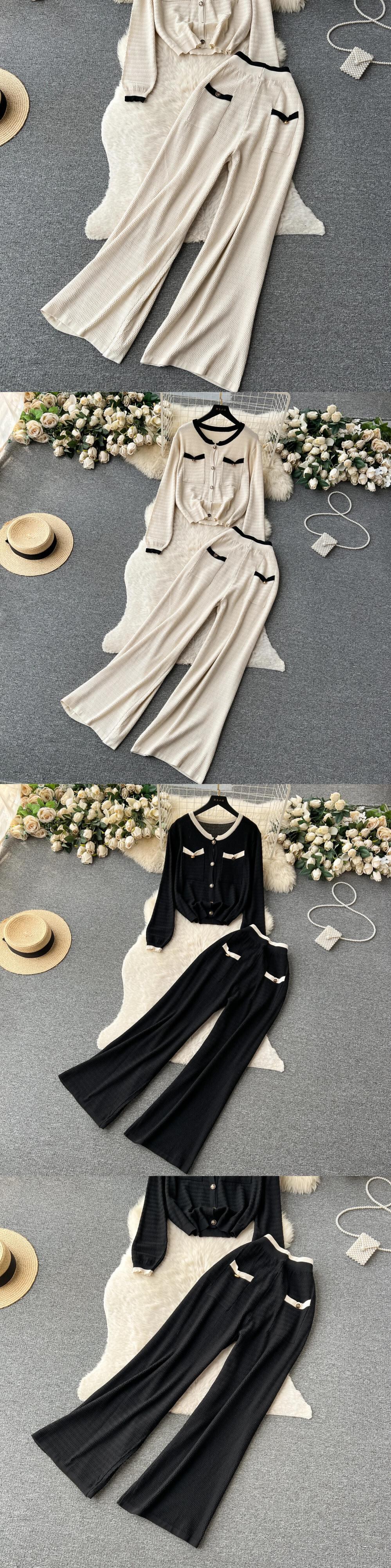ニットスーツシングルブレストポケットカーディガン + ワイドレッグロングパンツ秋オフィスレディルーズセーターセット オータム 秋物 ワイドパンツ 会社 学校 通勤や通学にも