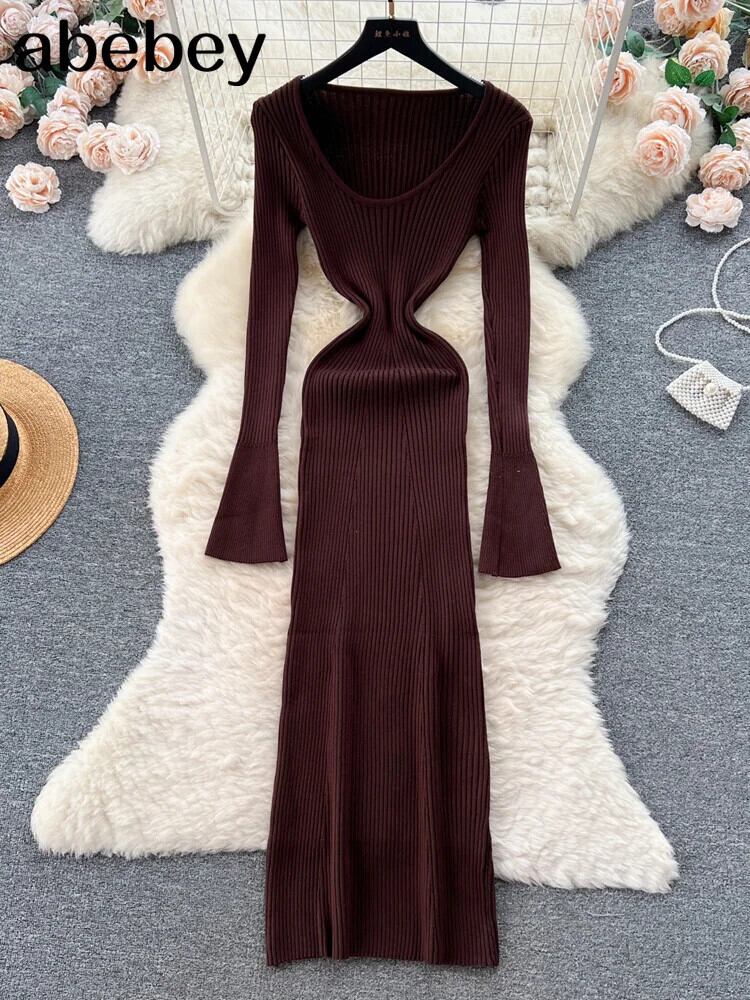 ドレスセクシーストラップレスリブニットボディコンドレス冬長袖ミディセータードレス ロング ウィンター 冬物