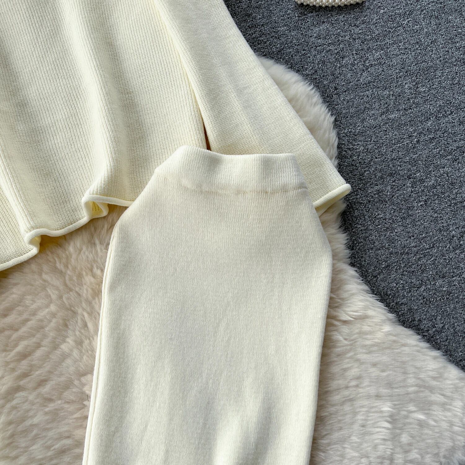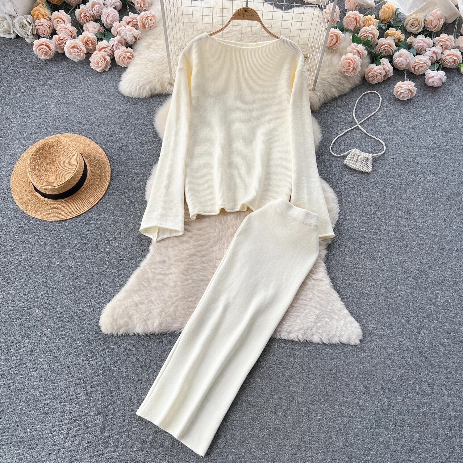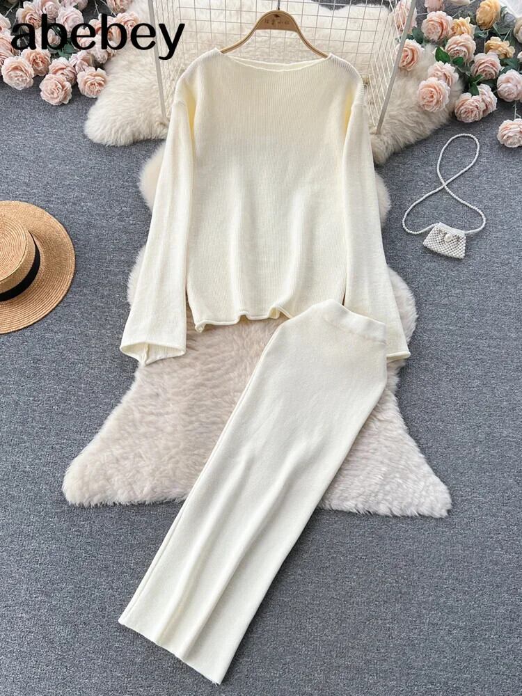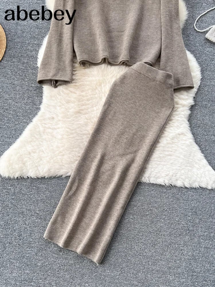 冬ストライプニットスーツオフショルダールーズプルオーバー + 弾性ロングスカート Soild 因果セーター 2 枚セット エラスティック 伸縮 ウィンター 冬物