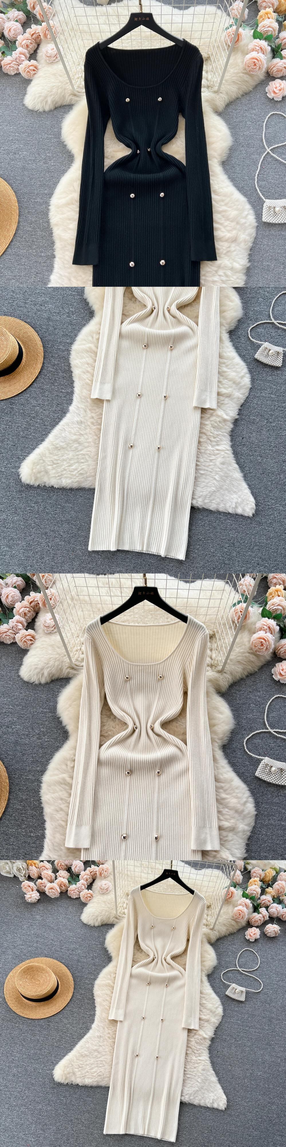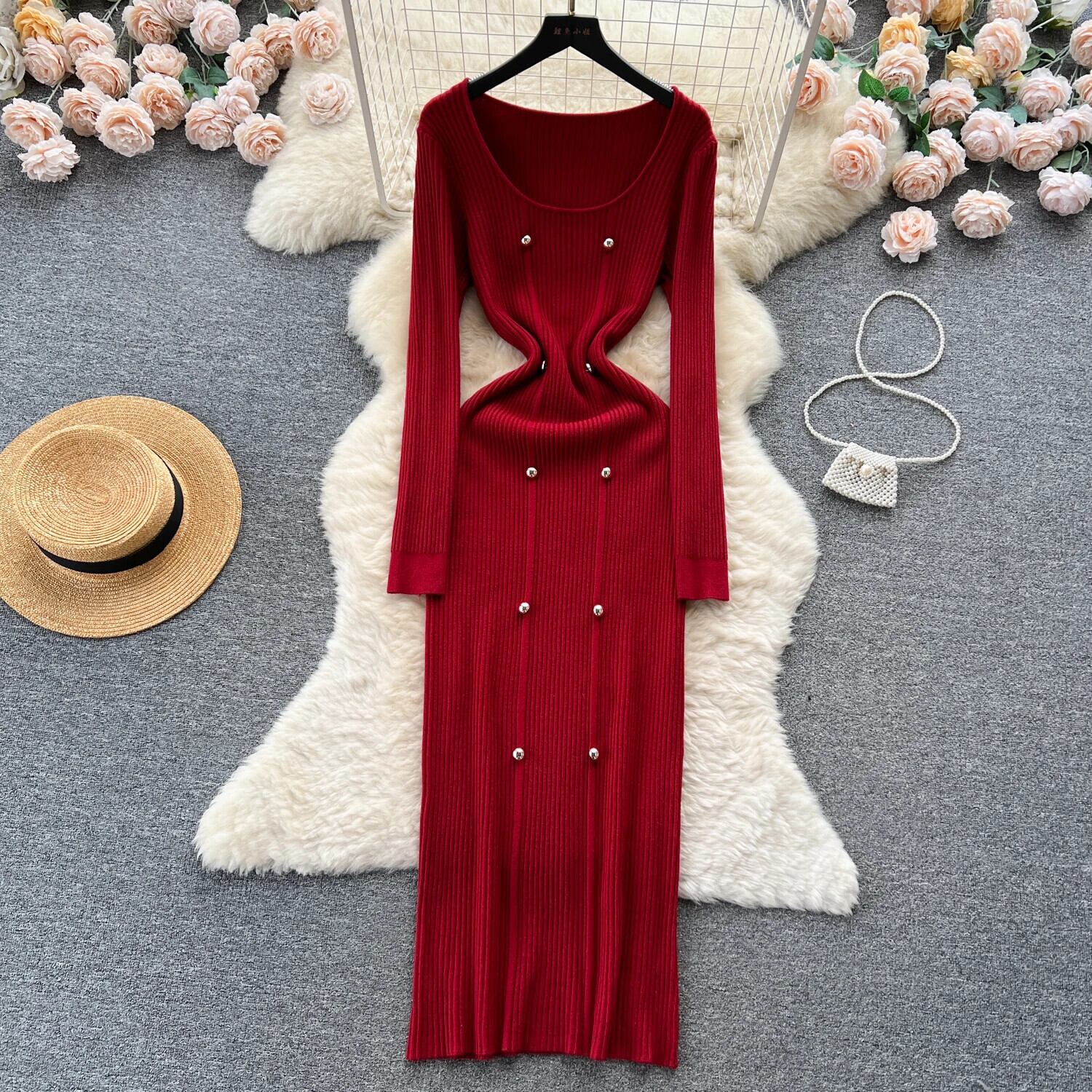 冬セータースキニードレス U ネックフルスリーブストライプ形シックシニアプリーツ OL ロングドレス ウィンター 冬物