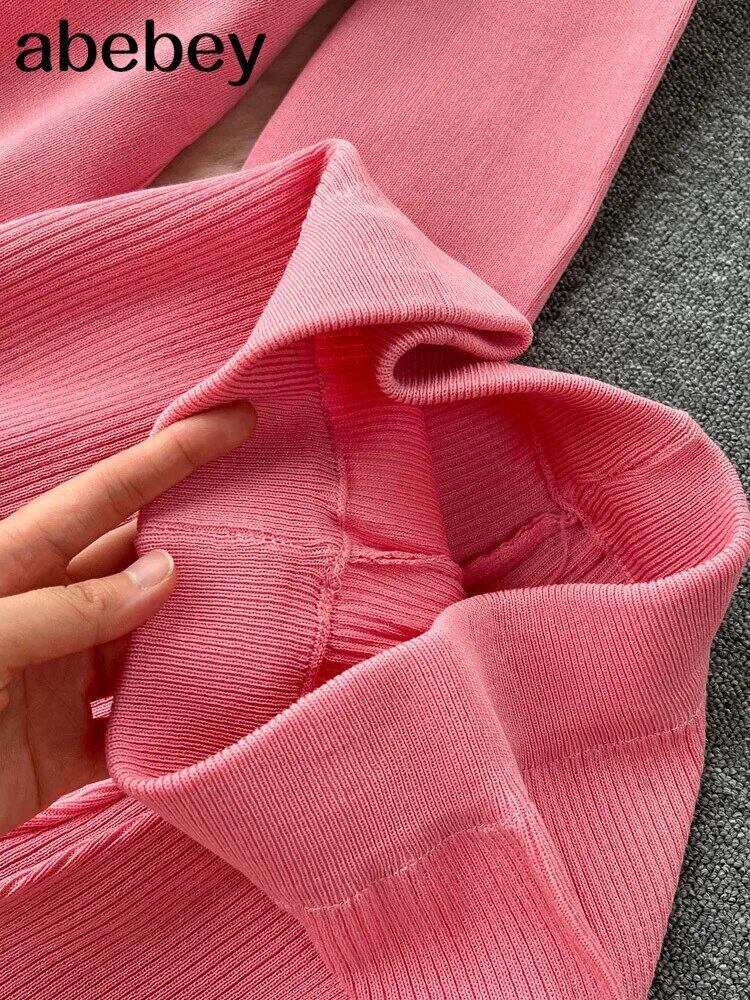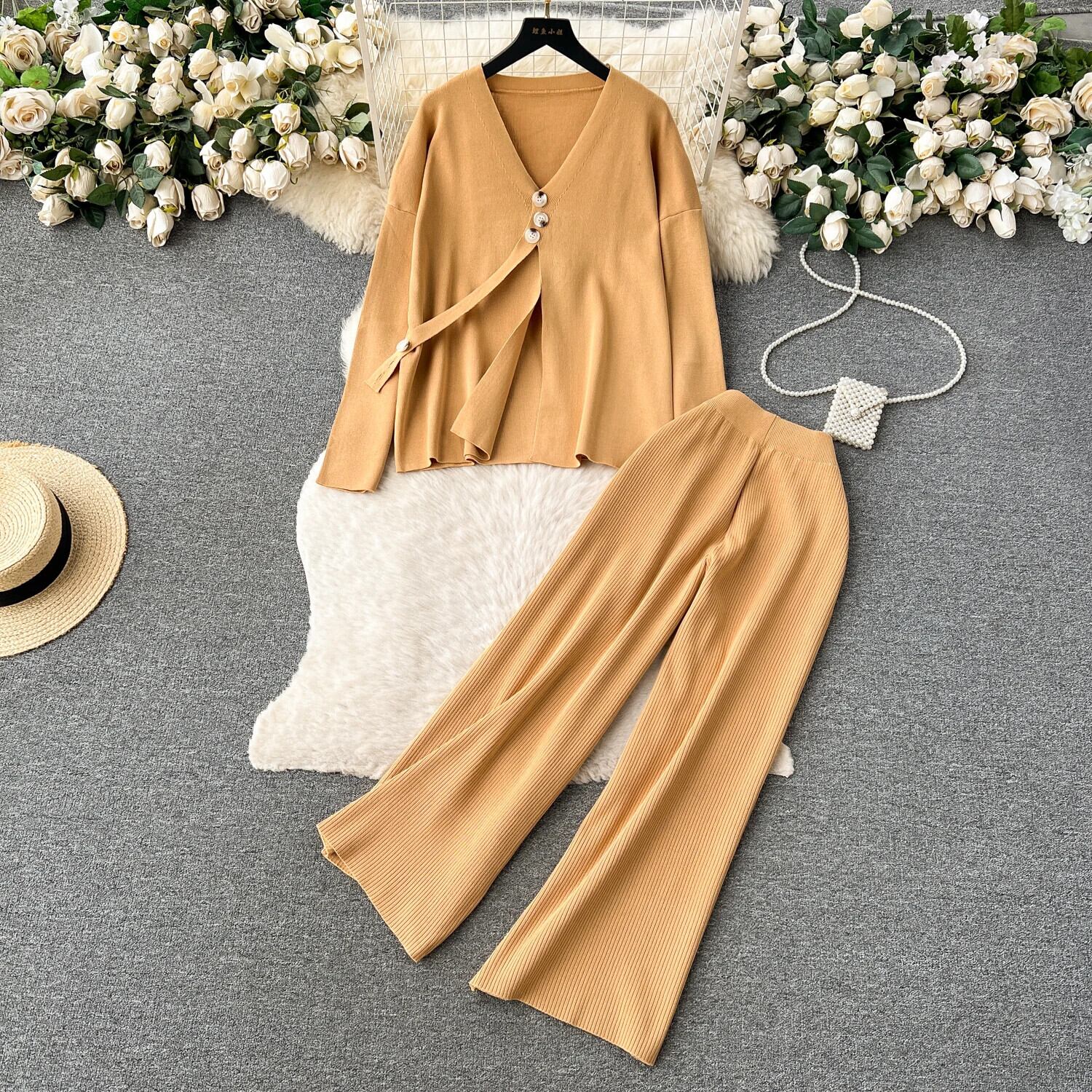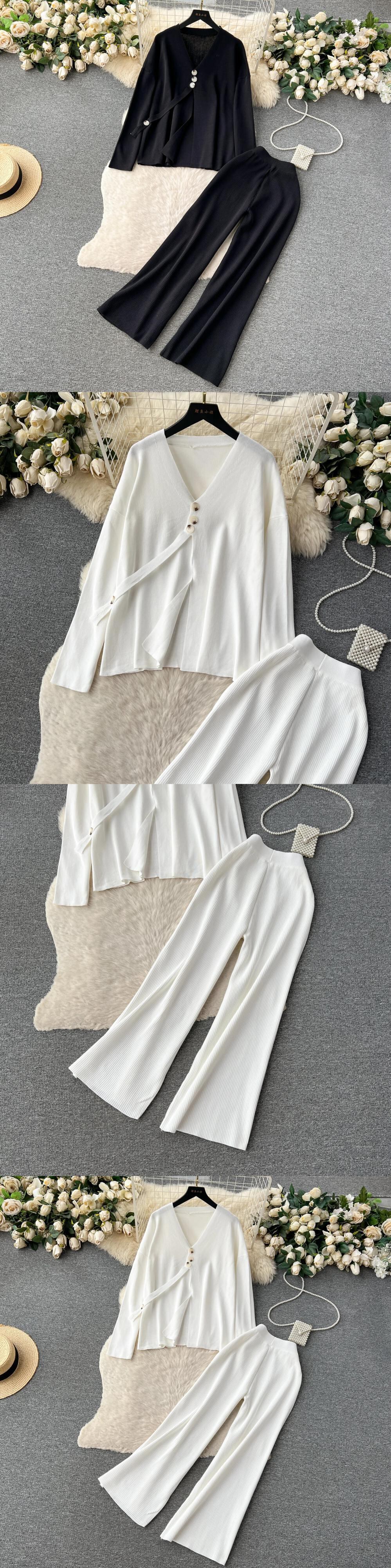 カーディガンセータージャージリブニットジャンパースーツ + ワイドレッグパンツ 2/2 ピース春セット スプリング 春物 ワイドパンツ