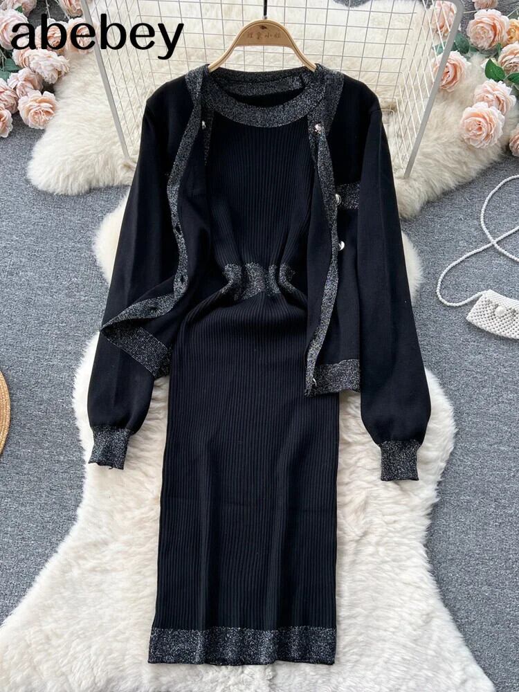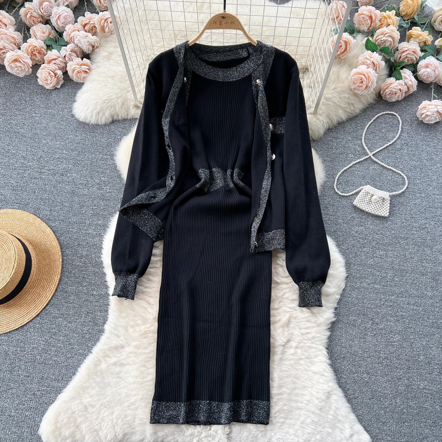 光沢あるニットロングドレスセット暖かいカーディガン + 弾性スリムドレス OL セーター 2 ピーススーツ エラスティック 伸縮