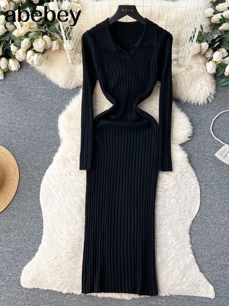 ニットセーターボディコンドレスターンダウン襟長袖スキニー秋フランス優しいストライプパーティードレス ロング オータム 秋物 ソリッドカラー