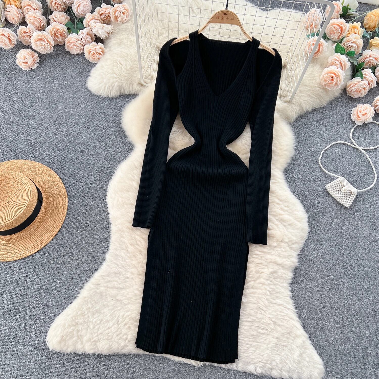 ニットセーターボディコンドレスディープVネック長袖スキニー秋フランス優しいソリッドストライプパーティードレス ロング オータム 秋物 ソリッドカラー
