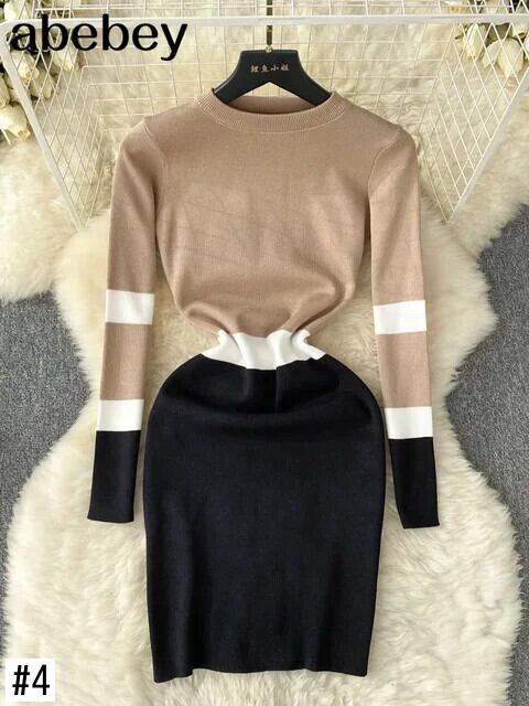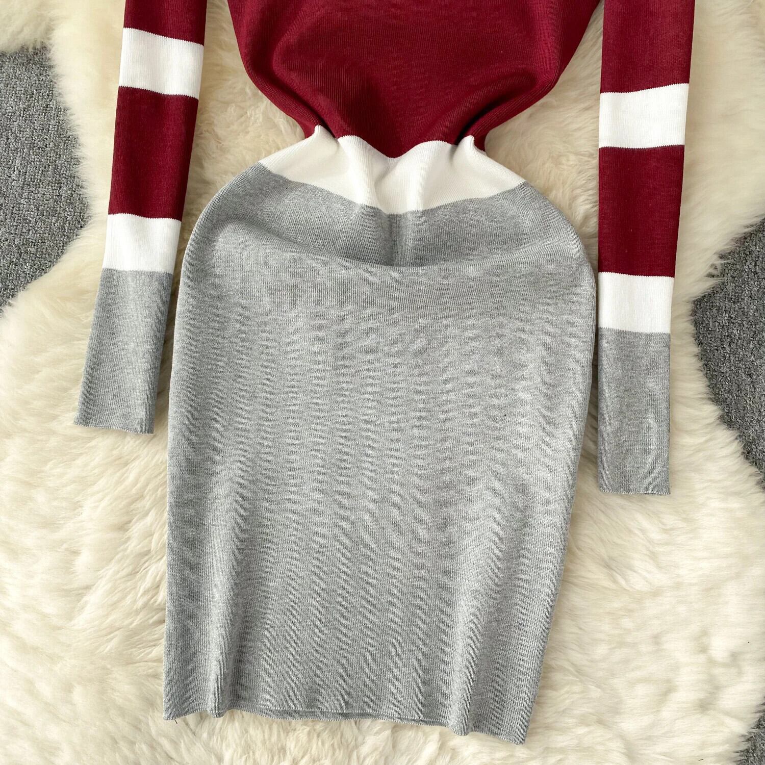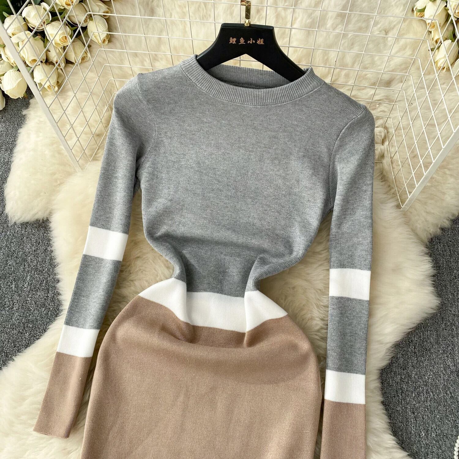 ニットストライプドレス O ネック長袖スキニー秋スタイルストリート基本ミニ OL ドレス ロング オータム 秋物 Oネック