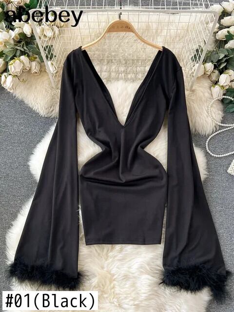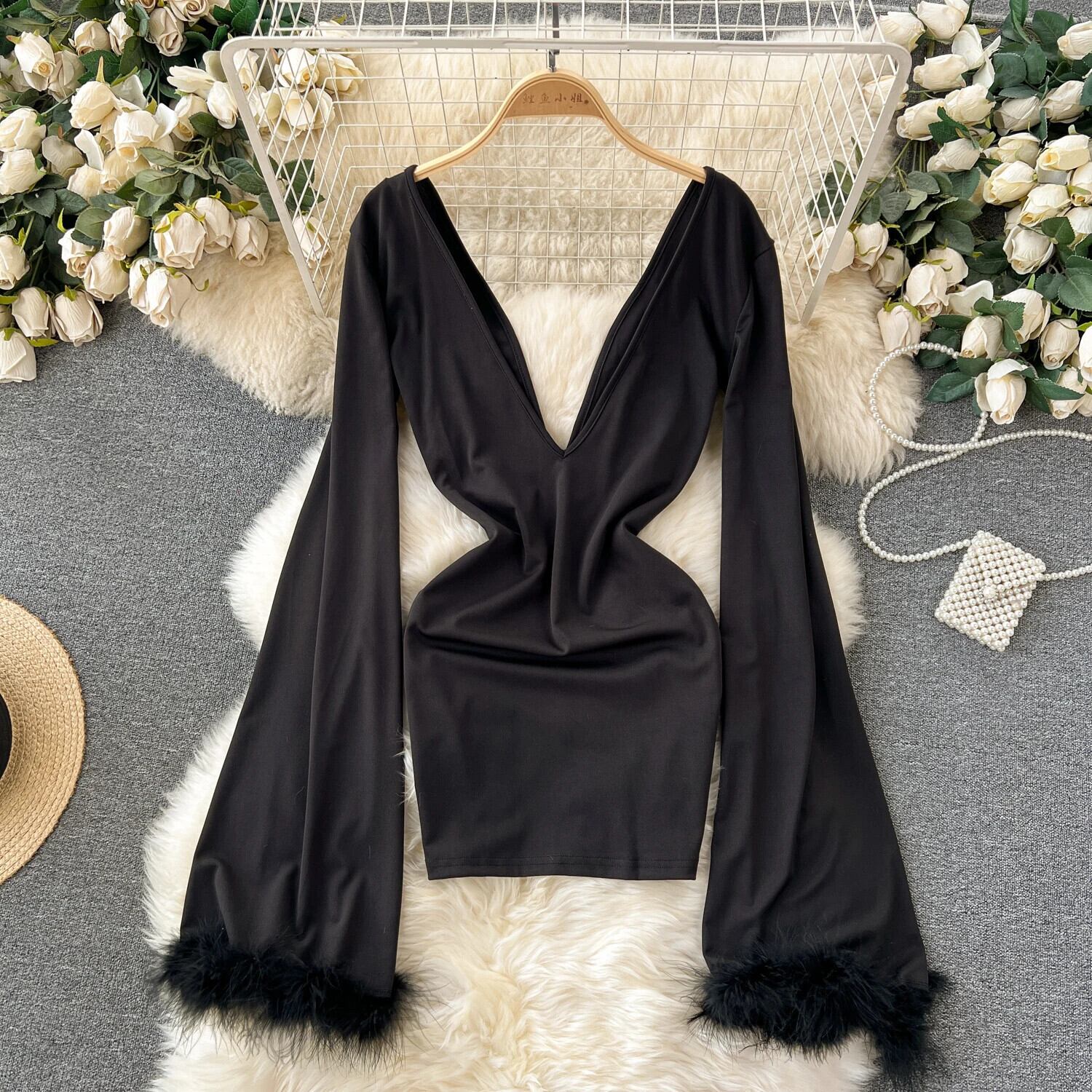 フェザーセクシー Y2K 長袖 V ネックボディコンミニドレスクラブパーティーイブニングウエディング秋衣装 ロング Vネック