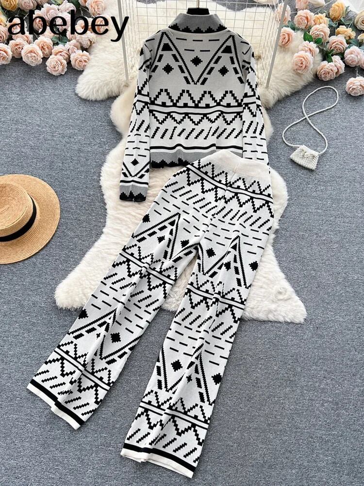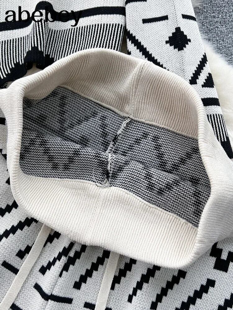 プリントセータースーツジッパールーズカーディガン + 巾着ワイドレッグロングパンツ冬ストリートセット ウィンター 冬物 ワイドパンツ