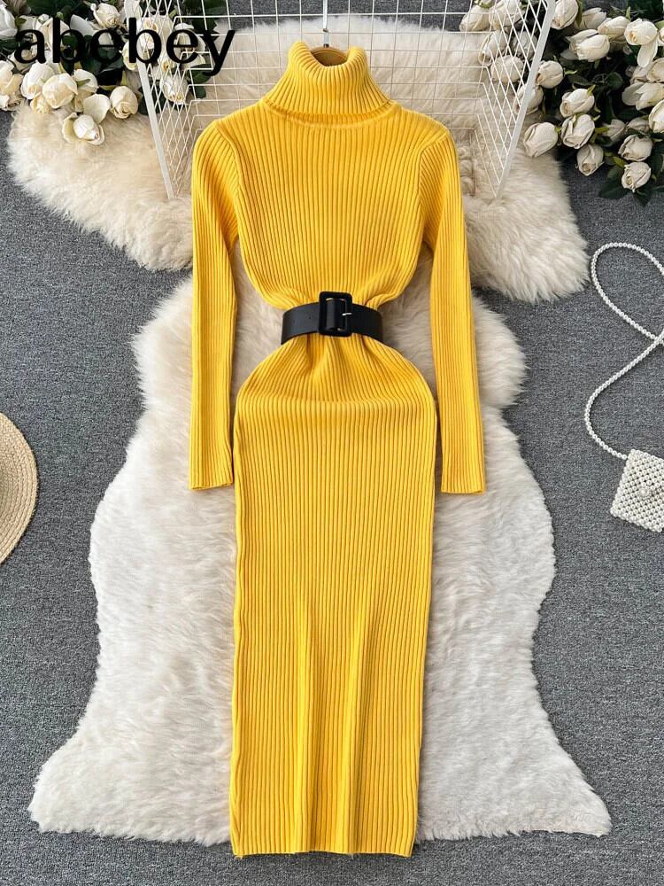 タートルネック長袖ニットソフトタイトペンシルドレスベルト付きスリム暖かいセーター Vestido セクシー冬ローブ ロング ウィンター 冬物 ハーネス