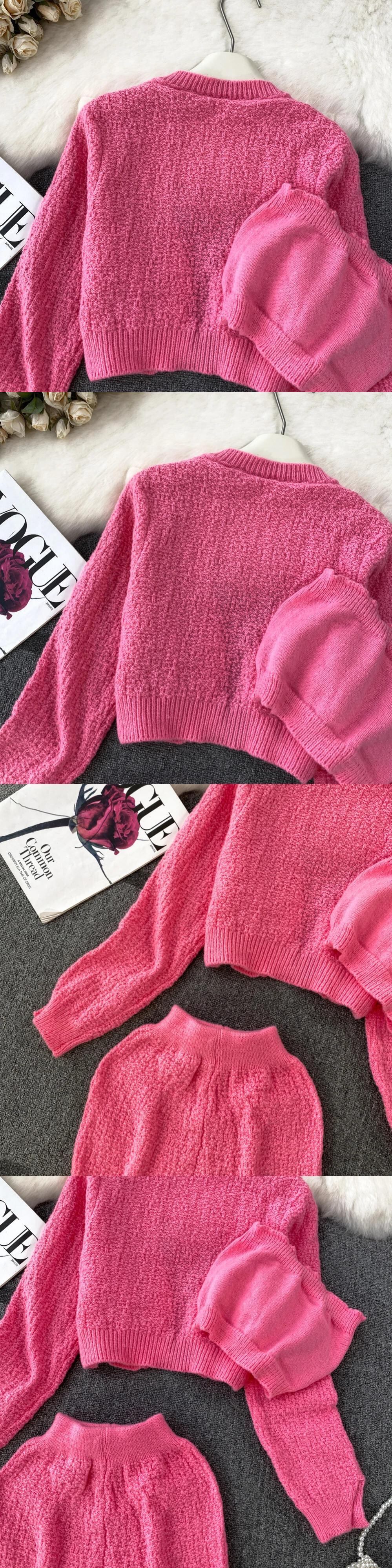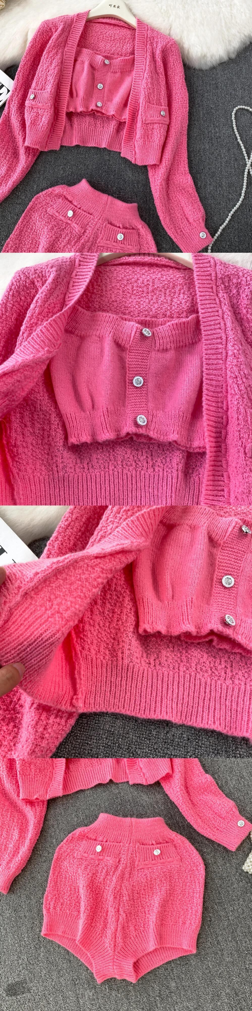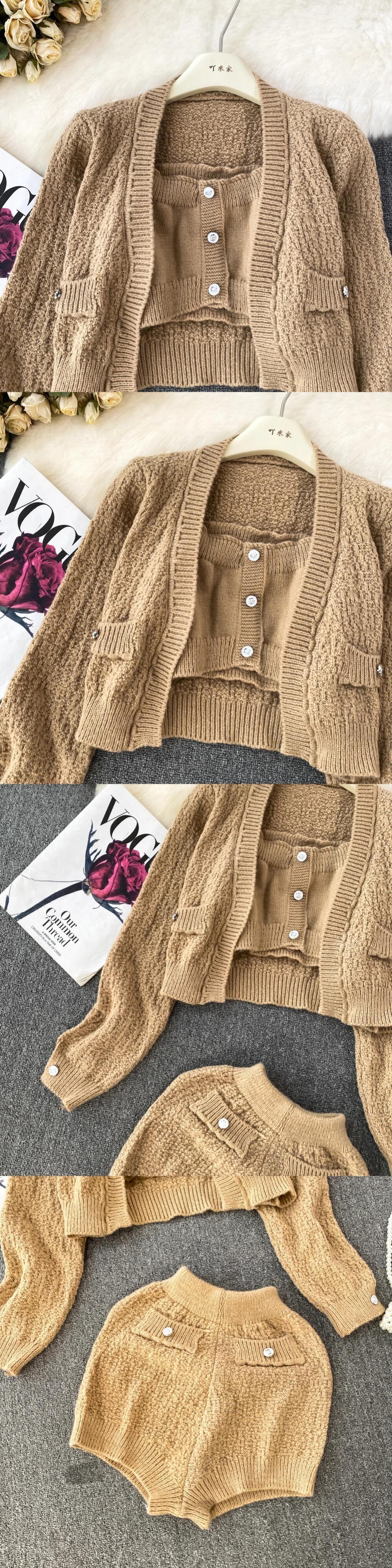 秋ニット 3 点セット長袖カーディガン + シングルブレストストラップレス + ストレッチウエストショートパンツスーツ ロング オータム 秋物 ショーツ ブルマー